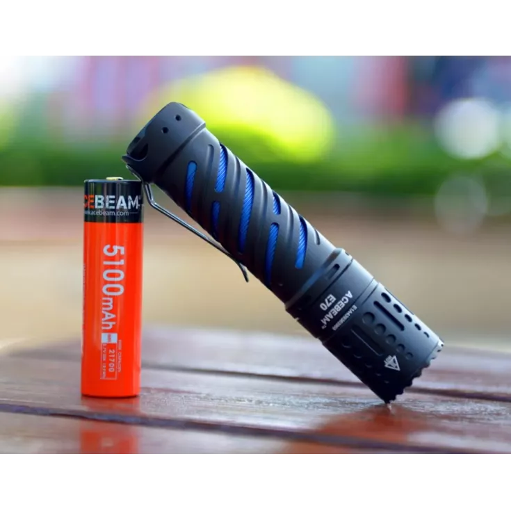The Acebeam E70 flashlight has a maximum output of 4600 lumens from the XHP70.2 6500K cool white LED and is powered by 1 x 21700 li-ion battery. The included Acebeam battery has a 5100mAh capacity and a built-in USB-C charging port for direct charging into the cell.