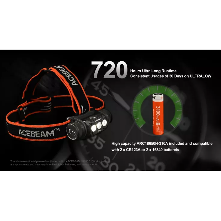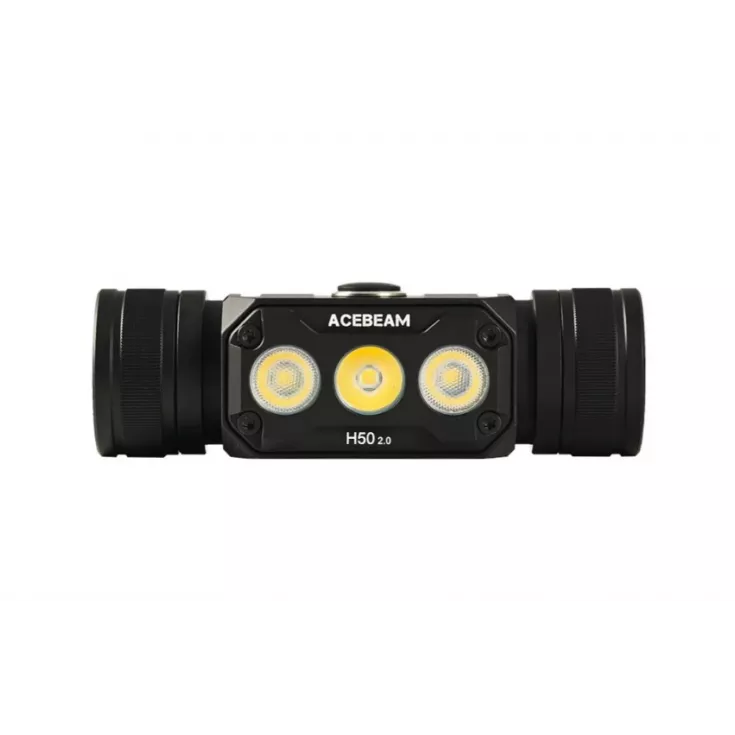 The Acebeam H50 2.0 headlamp has a maximum output of 2000 lumens from the 3 x Luminus SST-20 LEDs and is powered by 1 x 18650 li-ion battery (included). The light is rechargeable by a concealed USB-C charging port which can be found at the end of the head torch.