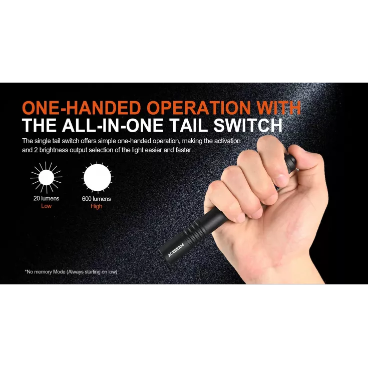 Operation of the Acebeam Pokelit is via a single tail switch and with just two brightness levels, this no-nonsense light will always turn on it low mode (no memory function) and then quick pres to access high output.