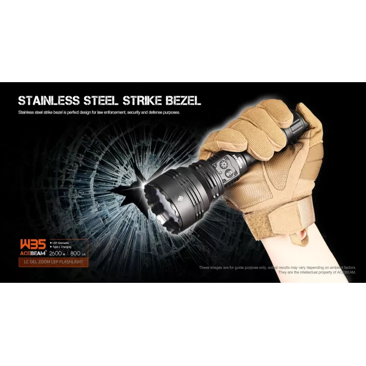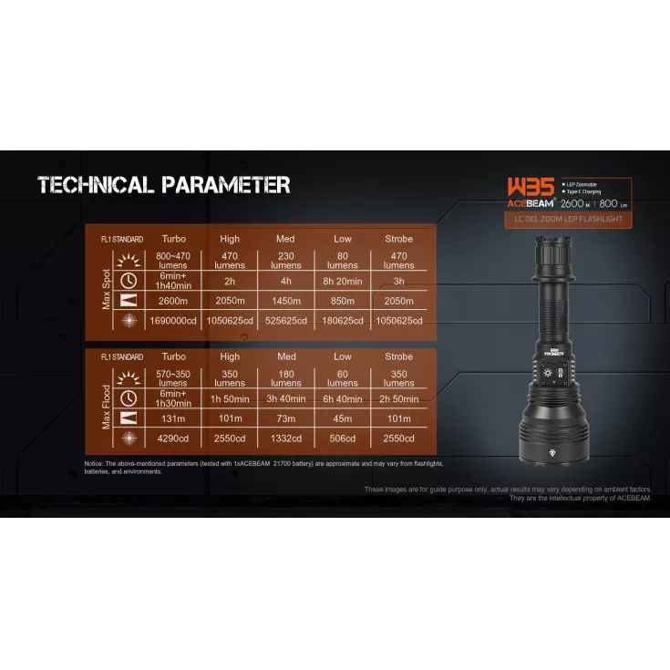 The Acebeam W35 is the first LC Del Zoom (Liquid Crystal Diffractive Electro-Optic Lens) LEP flashlight available, powered by 1x Acebeam 21700 Battery to produce a maximum brightness of 800 lumens at up to 2600 metres.
