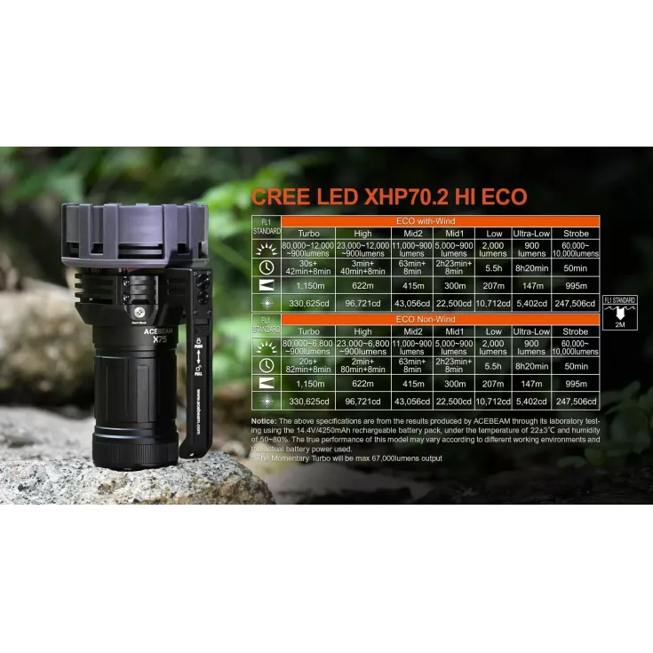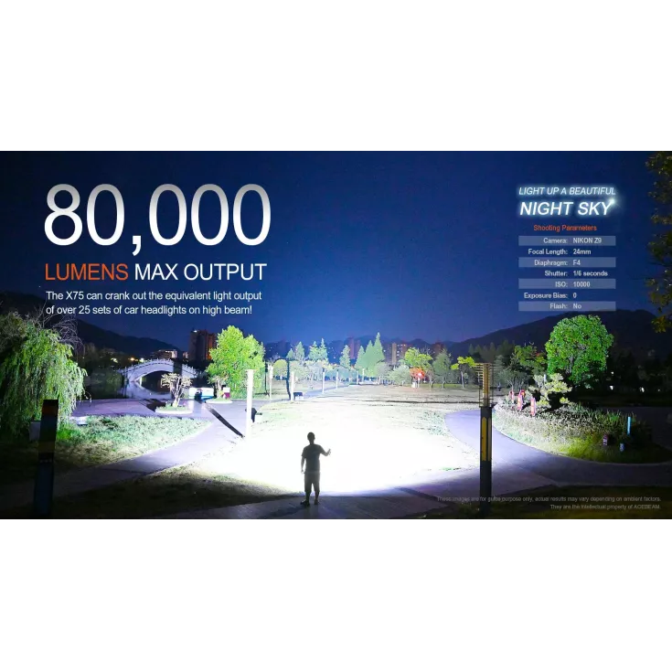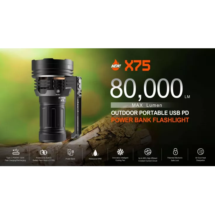The Acebeam X75 flashlight has an astounding output of 80,000 lumens from the 12 x XHP70.2 6500K LEDs and is powered by a built-in battery pack made up of 4 x 21700 li-ion cells.
