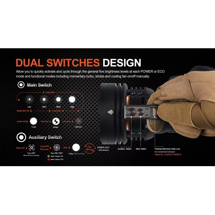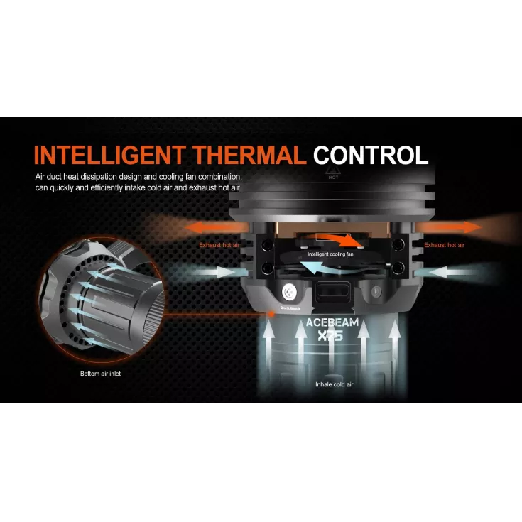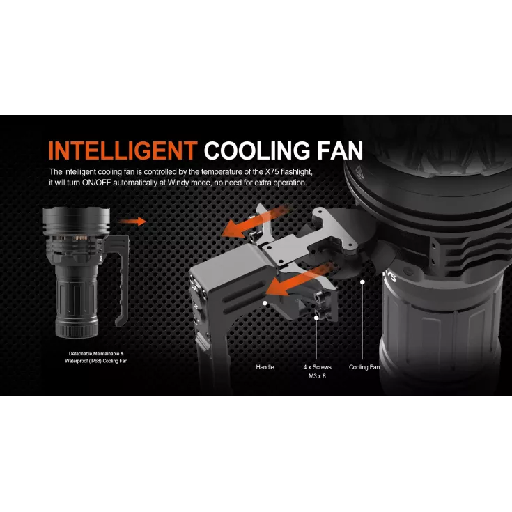 The light has an intelligent cooling fan built into the side handle, which is controlled by the temperature of the X75 and will turn on and off automatically in Windy mode. Combined with the air duct heat dissipation design, the torch can quickly and efficiently intake cool air and expel hot air.