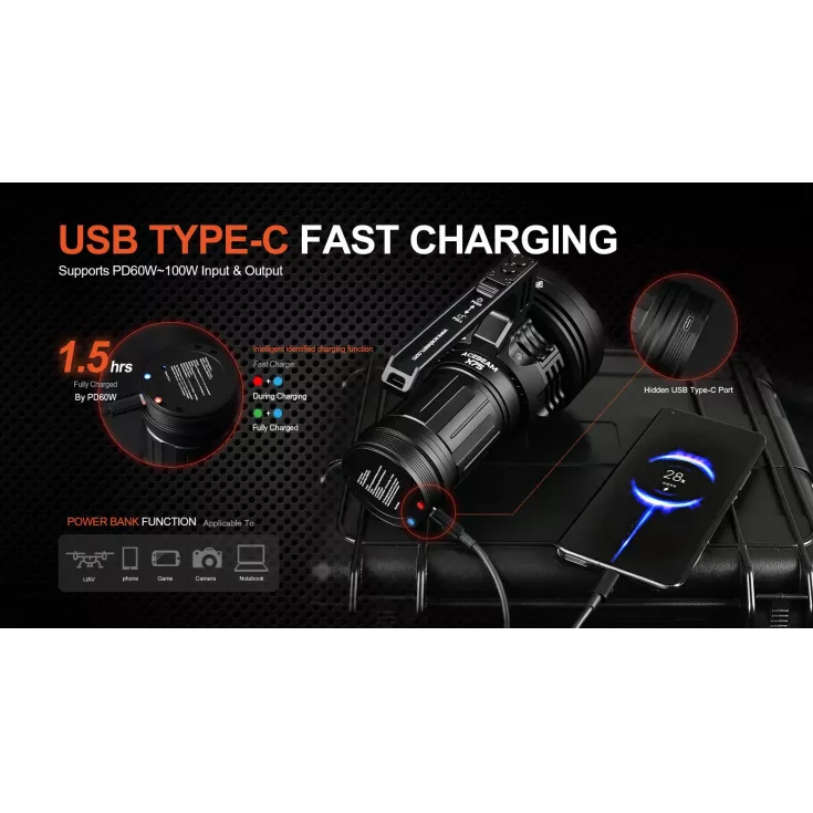 In addition to being a high power, high performance searchlight, the X75 can be used as a power bank, supporting PD60W~100W input and output. The flashlight has a hidden USB-C port at the tail end with charging indicators that change from red and blue whilst charging, to green and blue when fully charged.