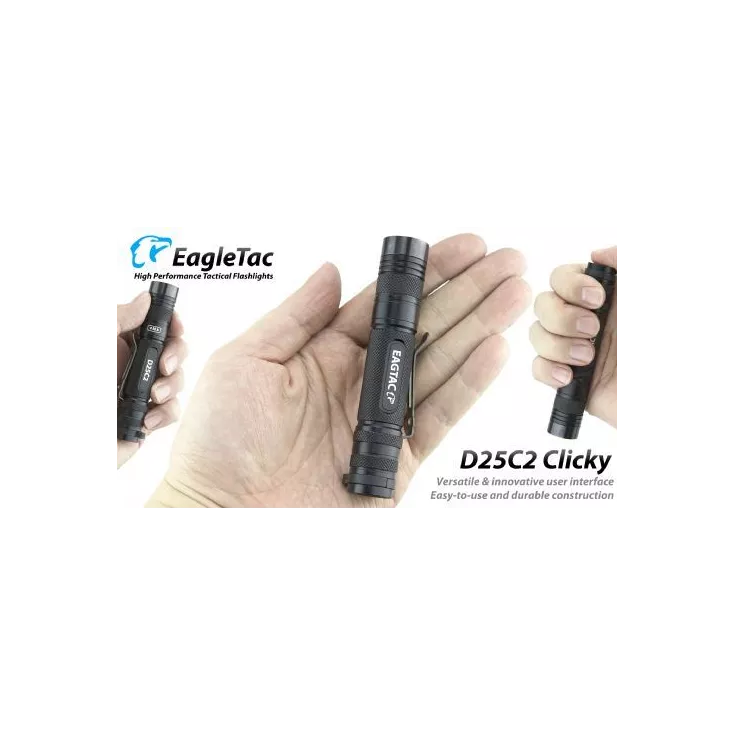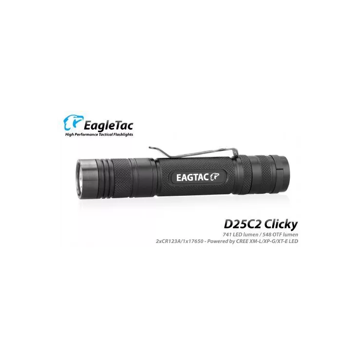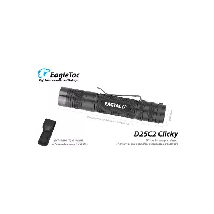 The EagleTac D25C2 flashlight is one of the smallest push button flashlight systems on the market powered by 2 x CR123 cells. Compact design, easy-to-use user interface, market leading output and brightness makes the EagleTac torch an extremely versatile flashlight for everyday carry.