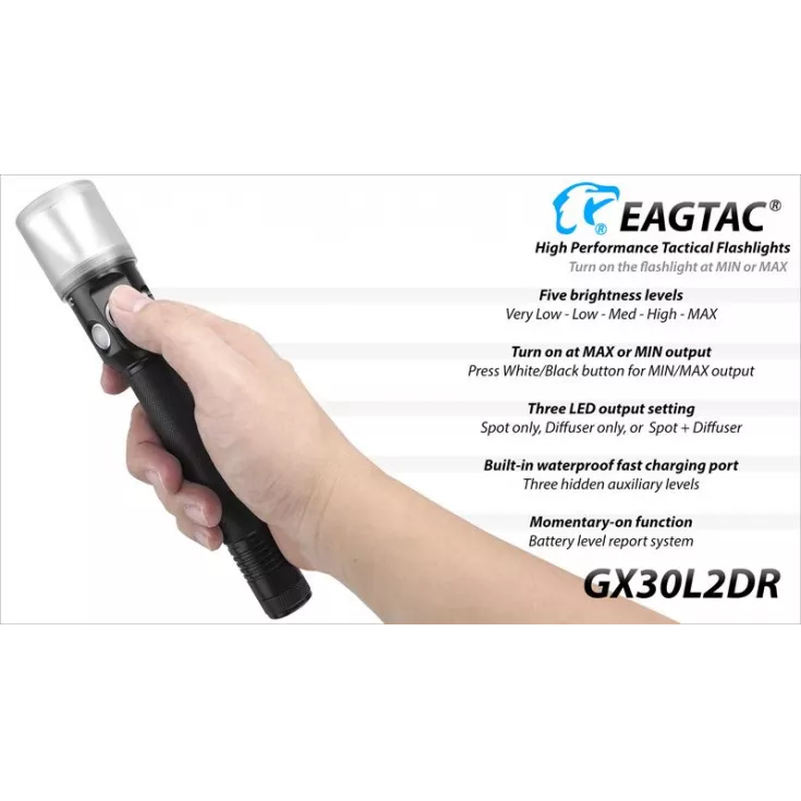 The GX30L2R-D flashlight has a spot mode (Cree XP-L HI V3 Cool White LED max 1250 ANSI lumens) & a diffuser mode (Flood 3014 SMT LED Array Cool White max 820 LED lumens) & a combined spot & diffuser mode.