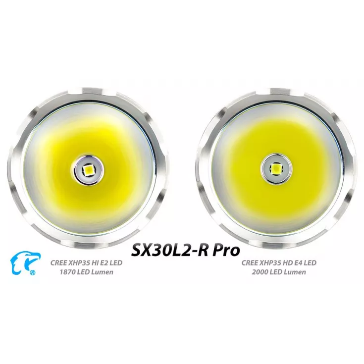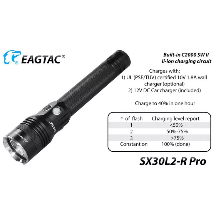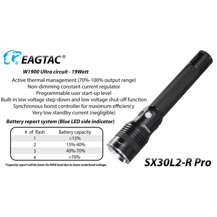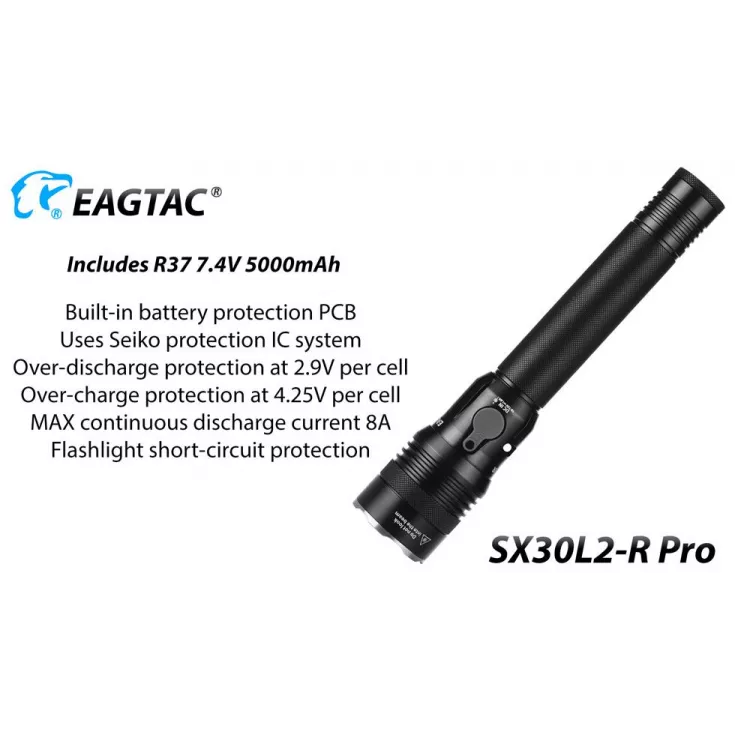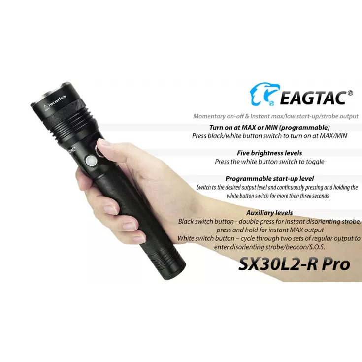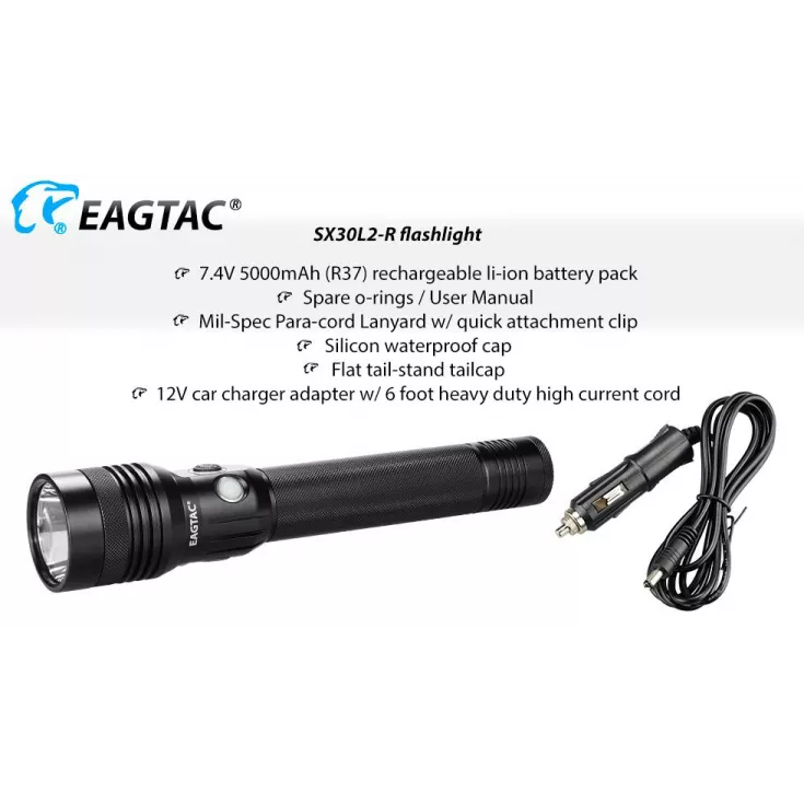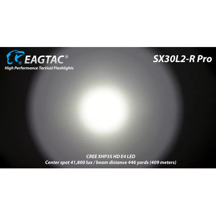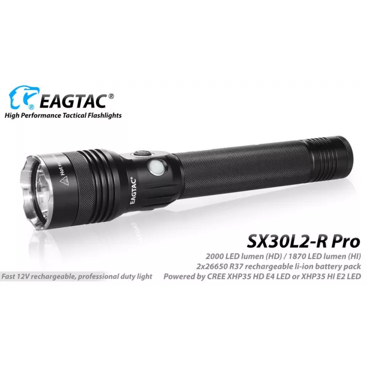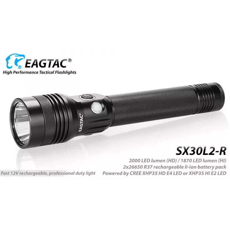The Eagletac SX30L2-R rechargeable torch has a maximum output of 1560 lumens from the Cree XHP35 HD E4 and is powered by an Eagletac R37 2 x 26650 battery pack.