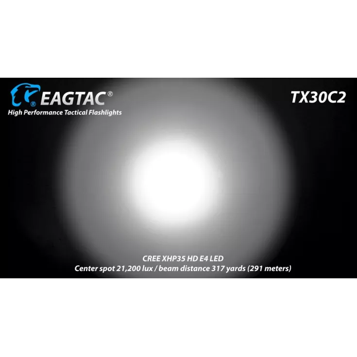 The Eagletac TX30C2 torch has a maximum output of 1603 lumens from the Cree XHP35 HD E4 LED or approximately 7% less from the Cree Nichia 219C LED. The flashlight is powered by either 1 x 18650 Li-ion batteries or 2 x CR123 single use cells. Please note, the Kit version comes with a body tube and can take 2 x 18650 batteries, however it cannot take 4 x CR123 single use cells.