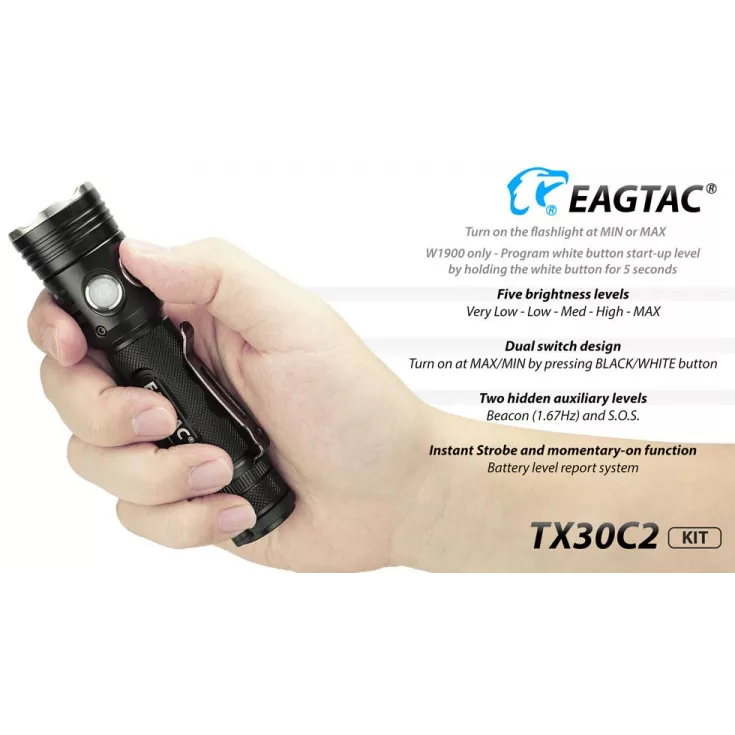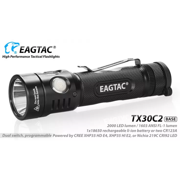 The handheld flashlight has five brightness levels plus a Beacon, Strobe and SOS mode which are operated using the dual switch design. Ranging from 14 to 1603 lumens (please note, the Nichia version output is approximately 7% less), the TX30C2 offers a lighting source suitable for a variety of applications.