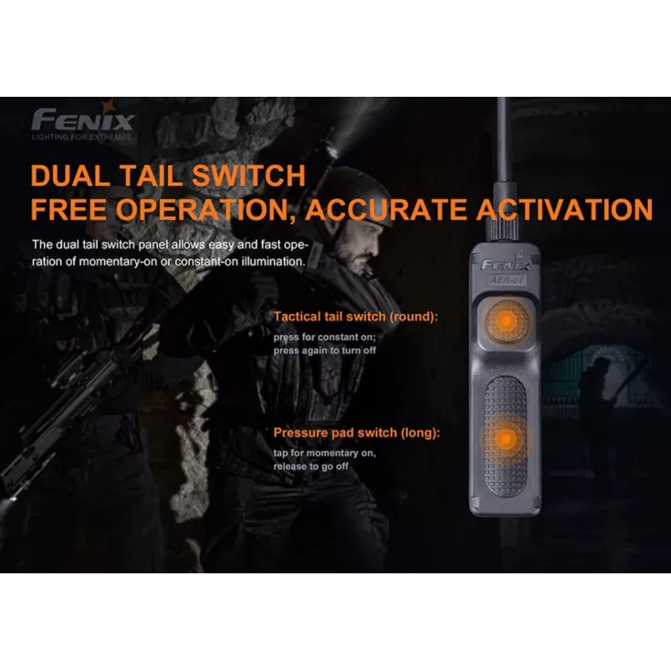 The dual tail switch panel includes a silent forward switch and a tape switch which allows for easy and fast operation of either momentary or constant illumination. The innovative silent design switch with attached Velcro is ideal for tactical and hunting applications.