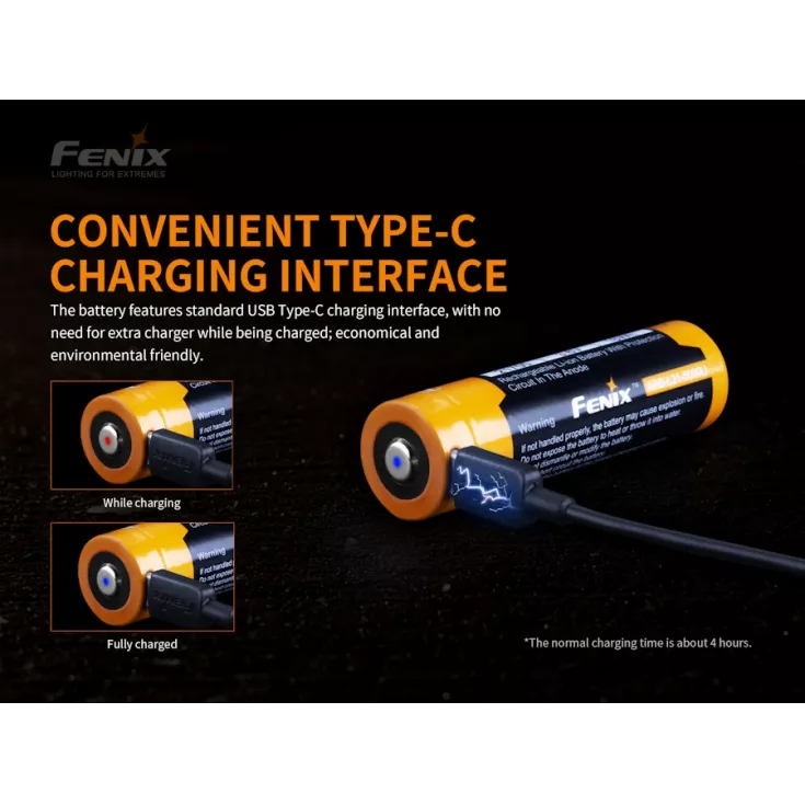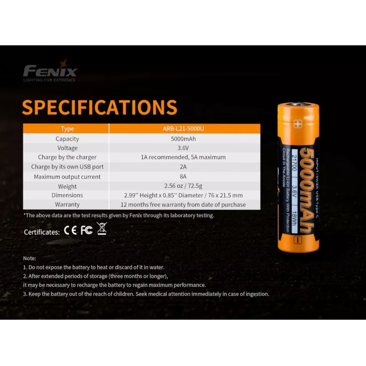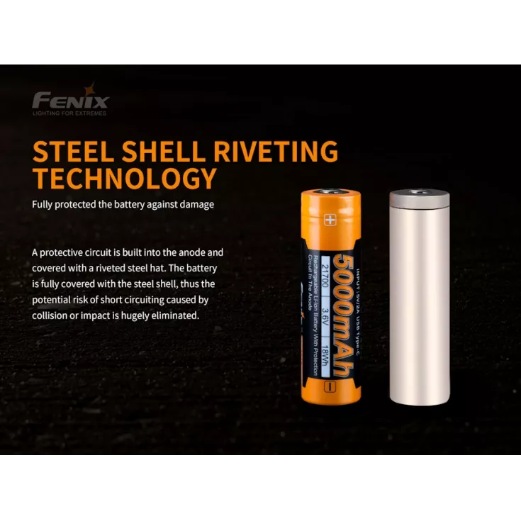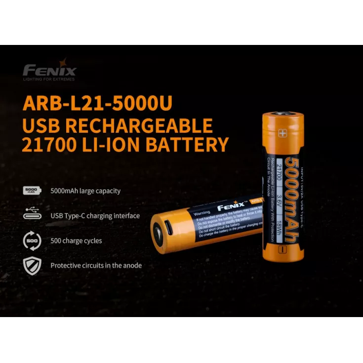 The Fenix ARB-L21-5000U battery is a high quality, li-ion, 21700 with a capacity of 5000mAh. The battery has a built-in USB-C port which removes the requirement for a separate external charger.