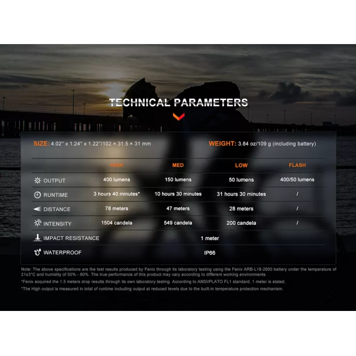 Med: 150 lumens (10 hrs 30 min), 47m beam