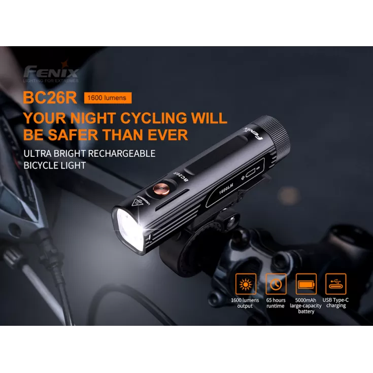 The Fenix BC26R bike light has an output of 1600 lumens powered by a Fenix ARB-L21-5000 battery (included).