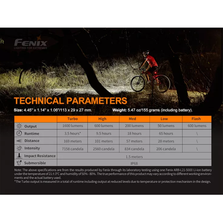 Turbo – 1600 lumens, 3.5 hour runtime, 169 meter beam distance