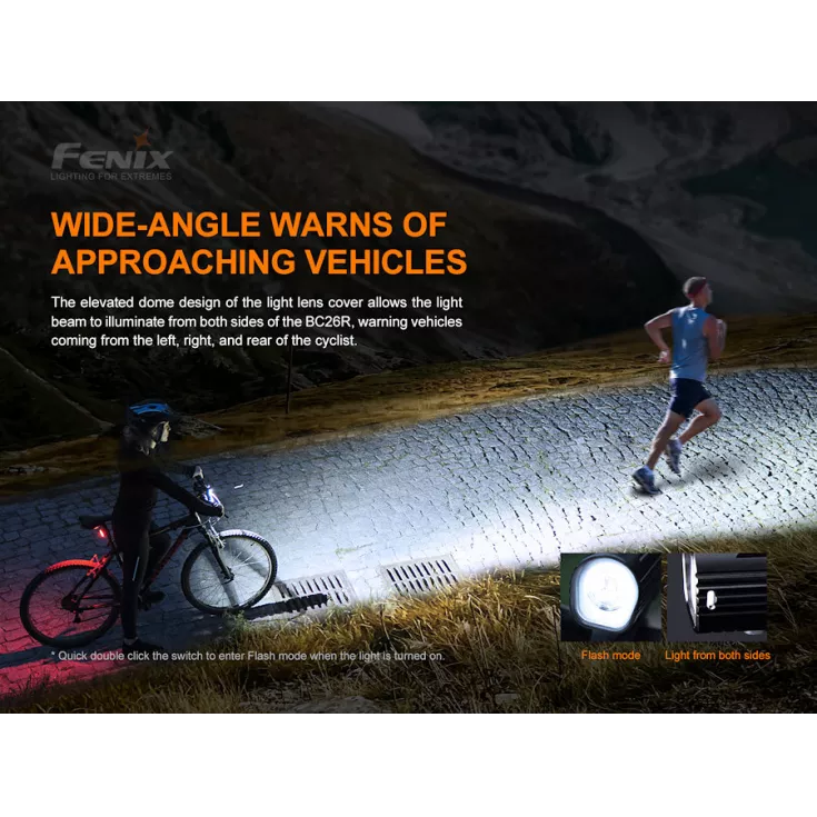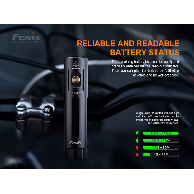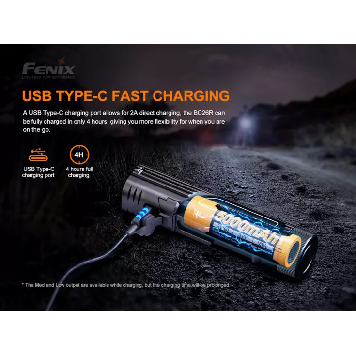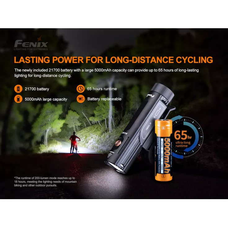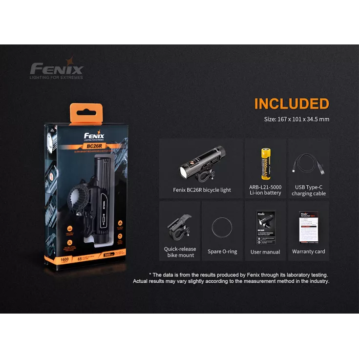 The Fenix BC26R includes:Â Fenix ARB-L21-5000 5000mAh li-ion 21700 battery, USB Type-C charging cable, quick release bike mount, spare o-ring.