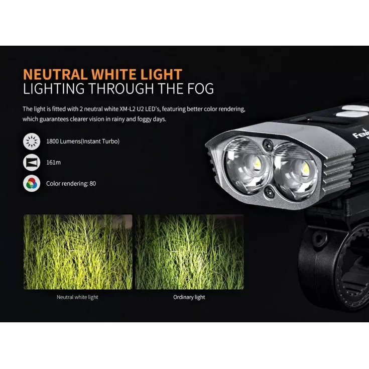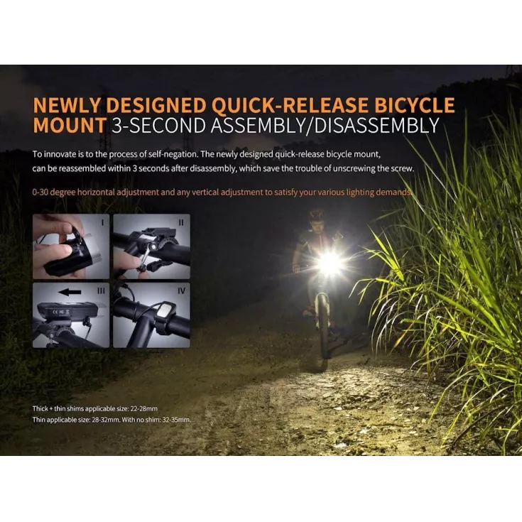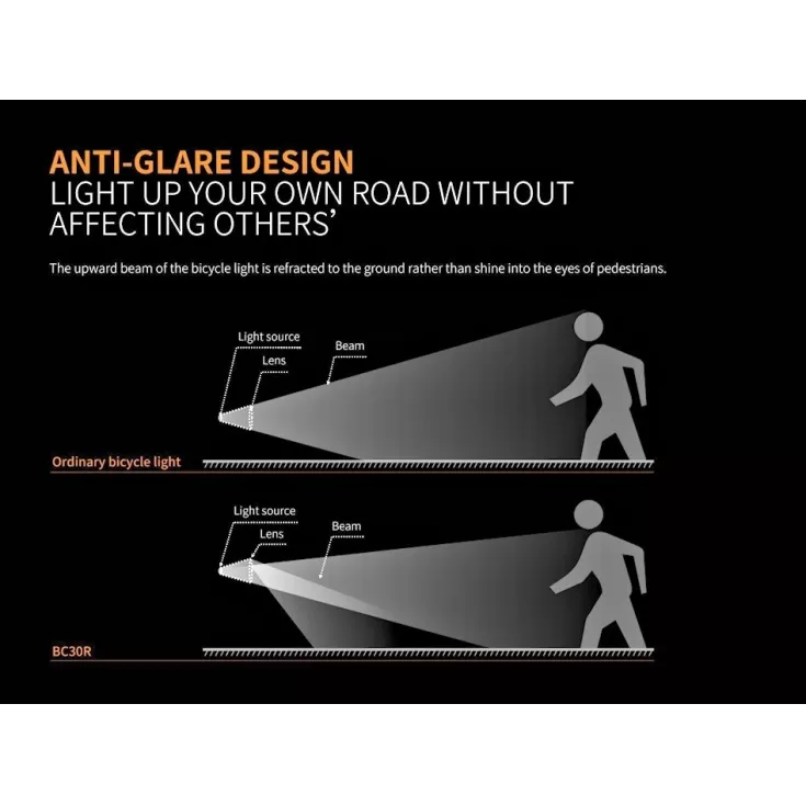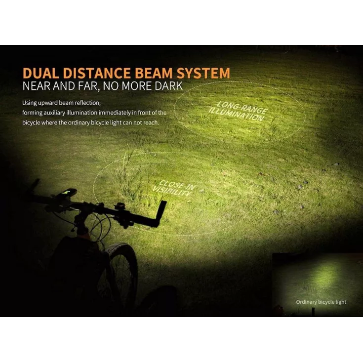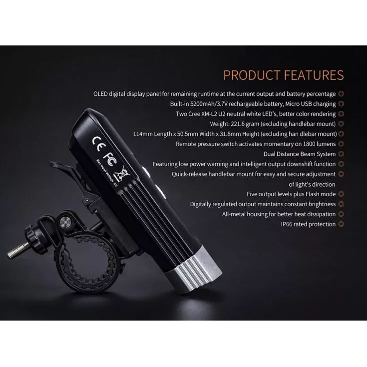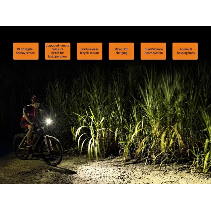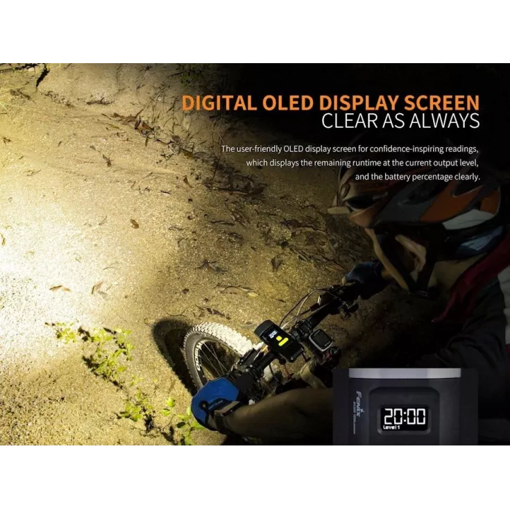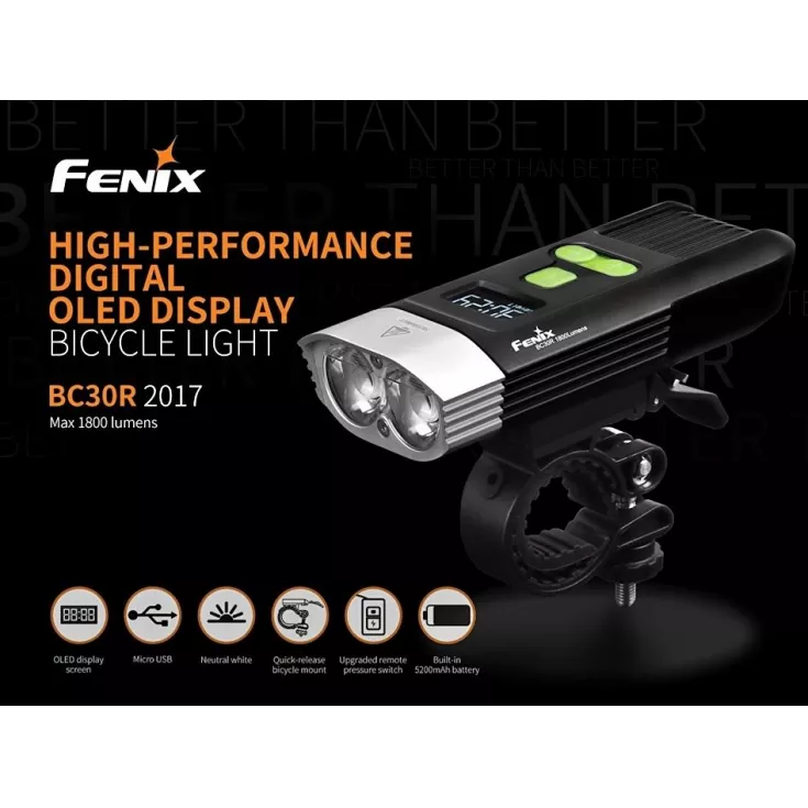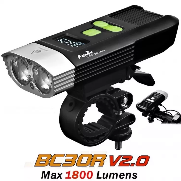 The Fenix BC30R V2.0 features an OLED digital display screen, an upgraded remote pressure switch for fast operation, a quick release bike mount, micro USB charging and a dual distance beam system, all combined in durable, all-metal housing.