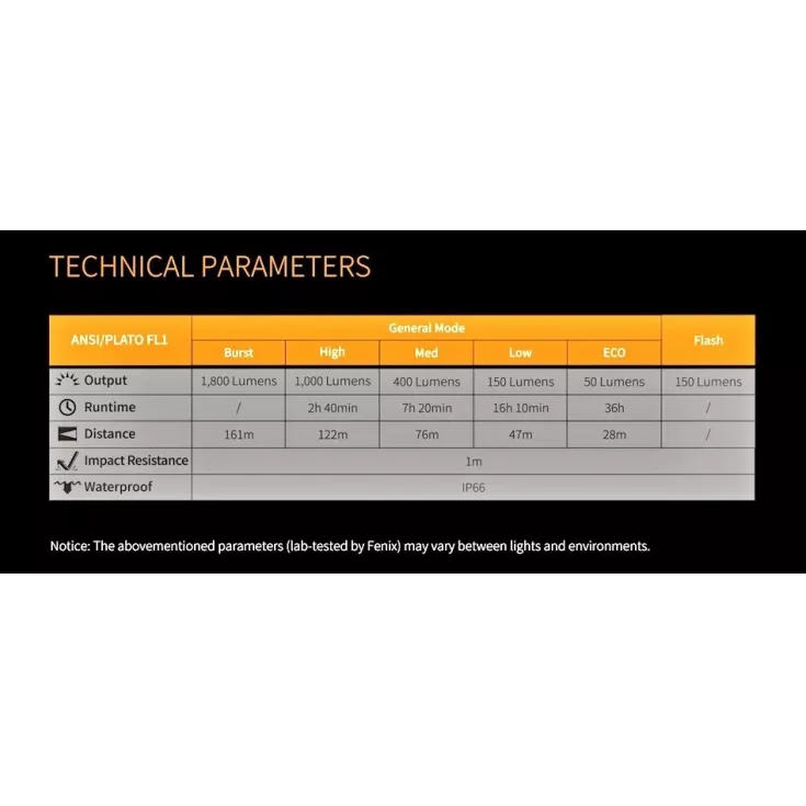 Low: 150 lumens – 16 hrs 10 mins runtime
