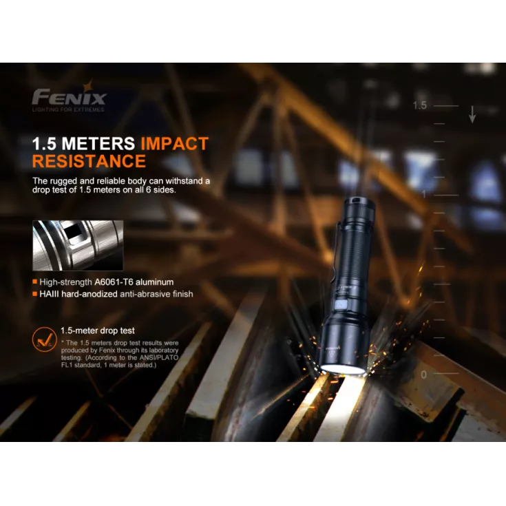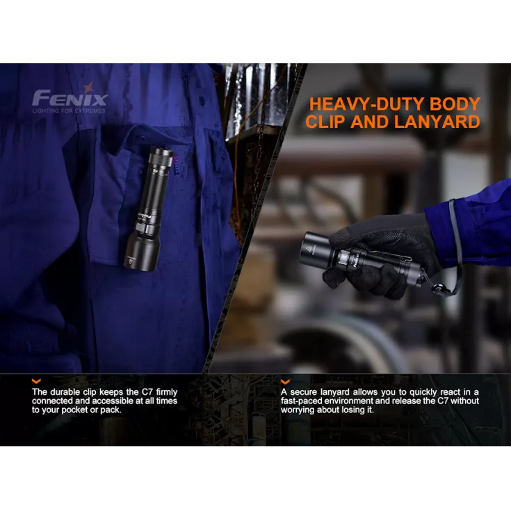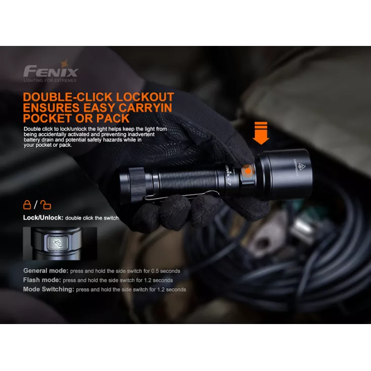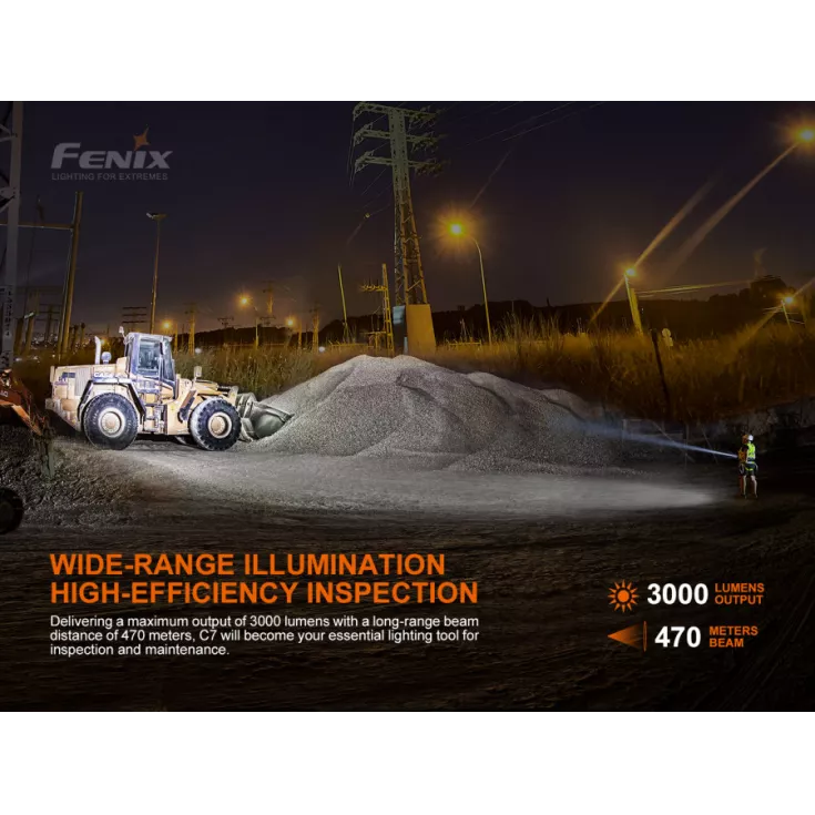 The Fenix C7 is a high performance, rechargable flashlight with an impressive 3000 lumens, a beam distance of 470 meters and is powered by a 21700 battery (included). It features 5 brightness levels plus a strobe and SOS mode.