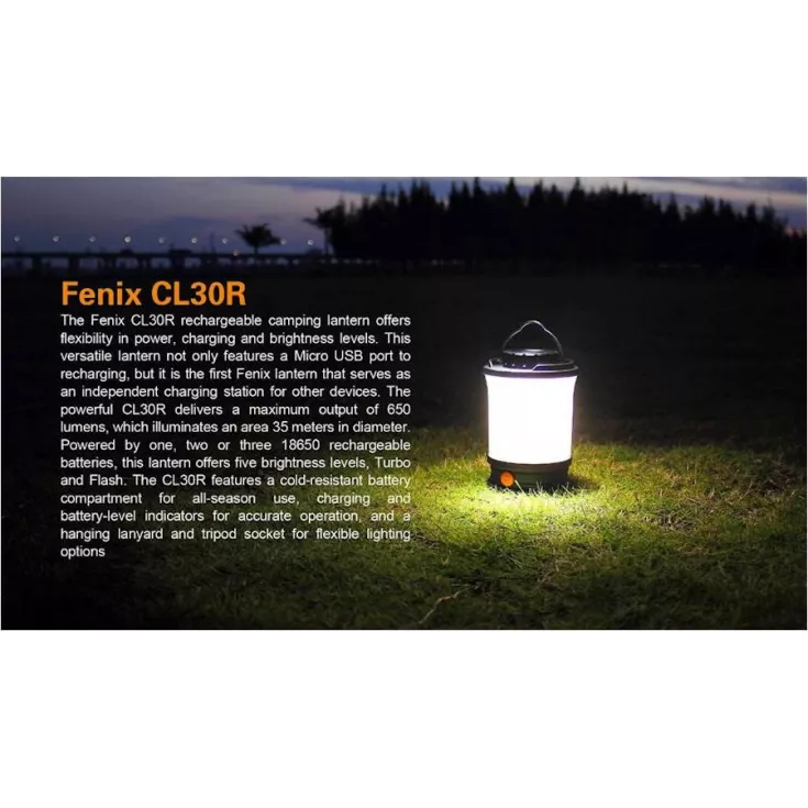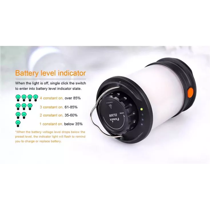 The rechargeable lantern offers flexibility in power, charging and brightness levels. The Fenix CL30R has a single all purpose switch & is constructed of high quality plastic.