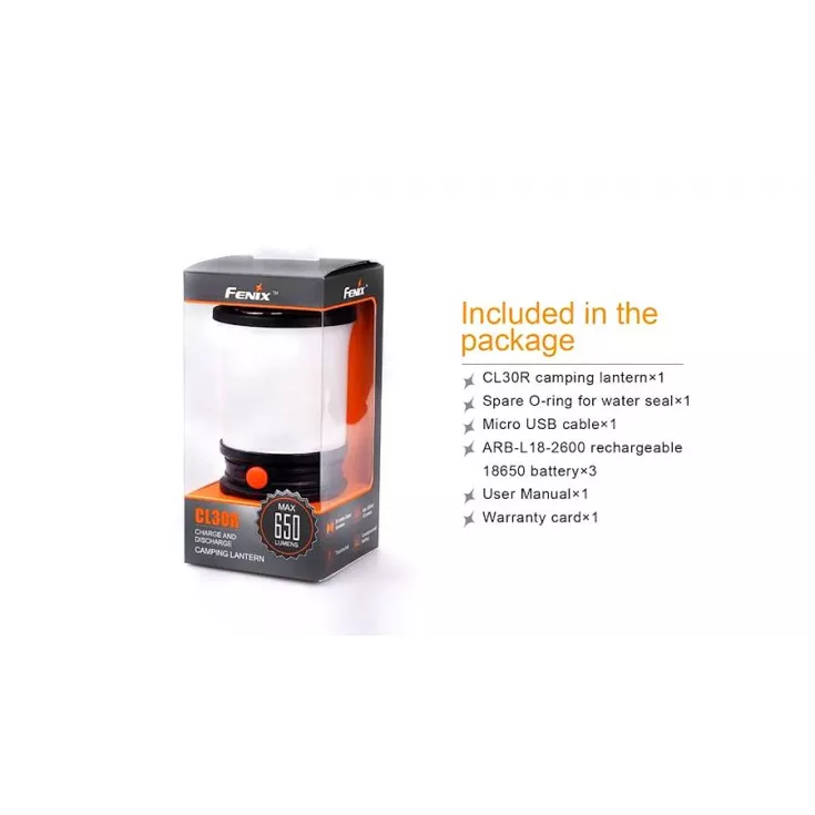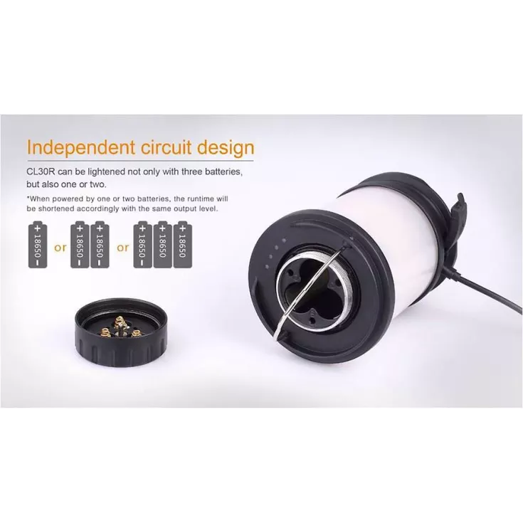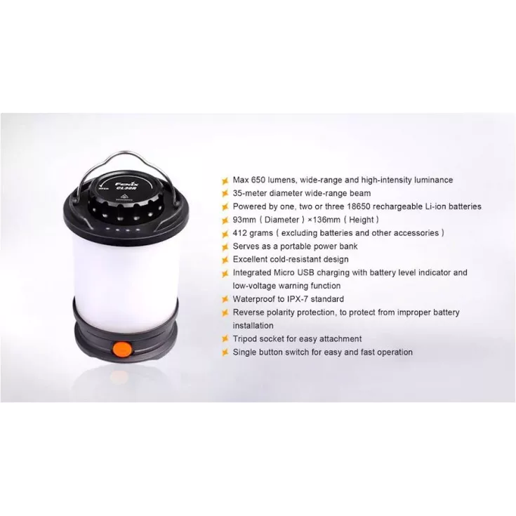 Not only does the CL30R have a Micro USB port for recharging, it is also the first Fenix camping lantern that serves as an independent charging station – use the internal 7800 mAh capacity as a power bank to charge other devices.