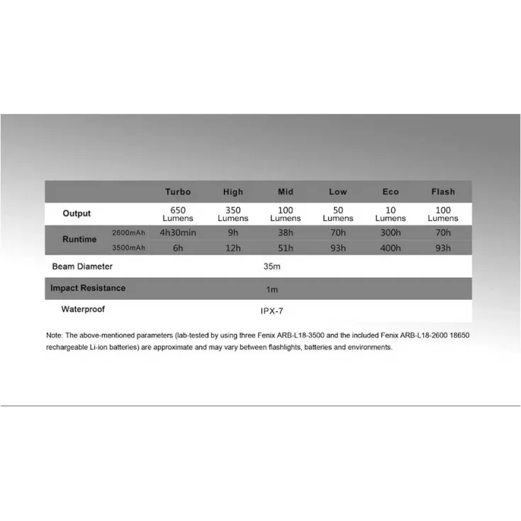 Includes: spare o-ring, micro USB charging cable, 3 x Fenix ARB-L18 2600 mAh rechargeable 18650 batteries.