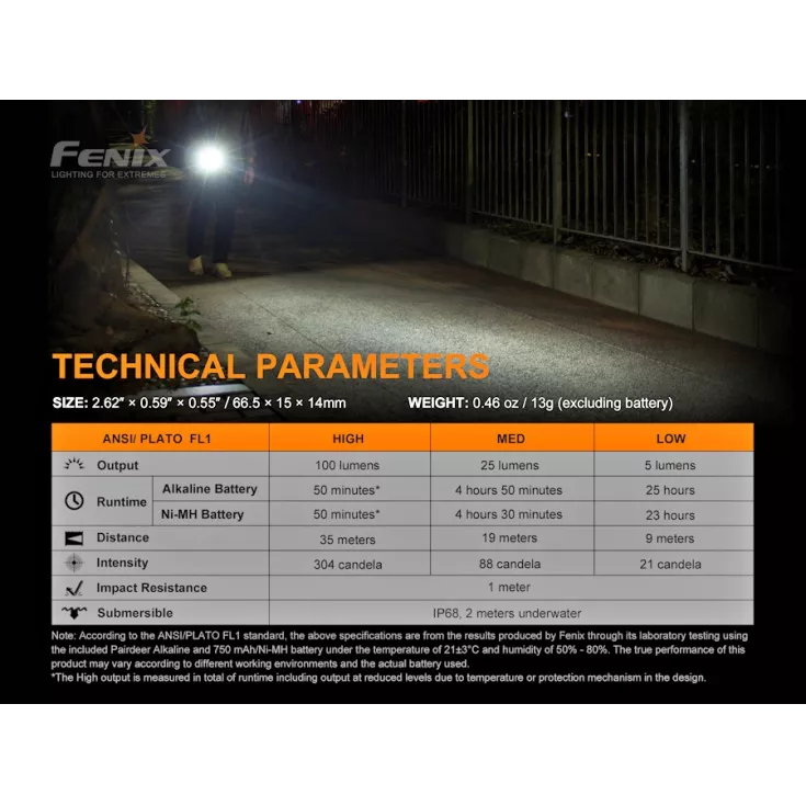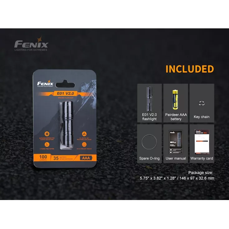 Includes: 1 x AAA alkaline battery, key chain, spare o-ring.
