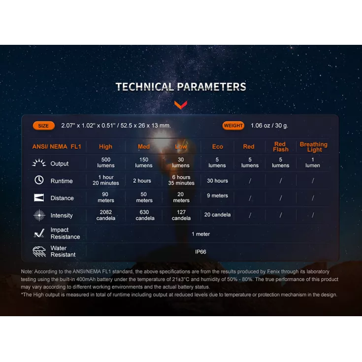 The Fenix E03R V2.0 features white and red LEDs with red flashing modes.