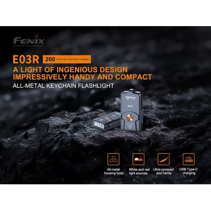 Fenix E03R Includes: Built-in lithium polymer battery, USB-C charging cable and key chain.
