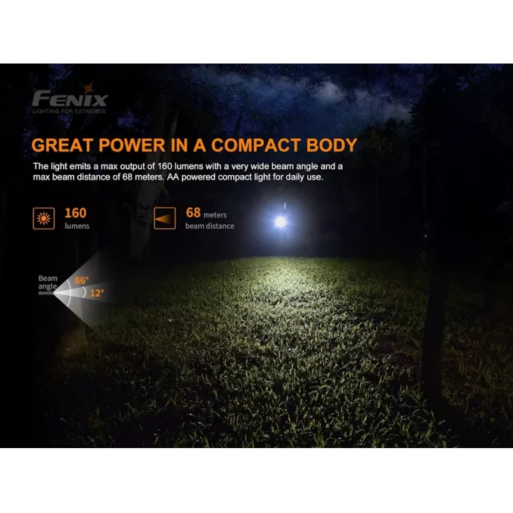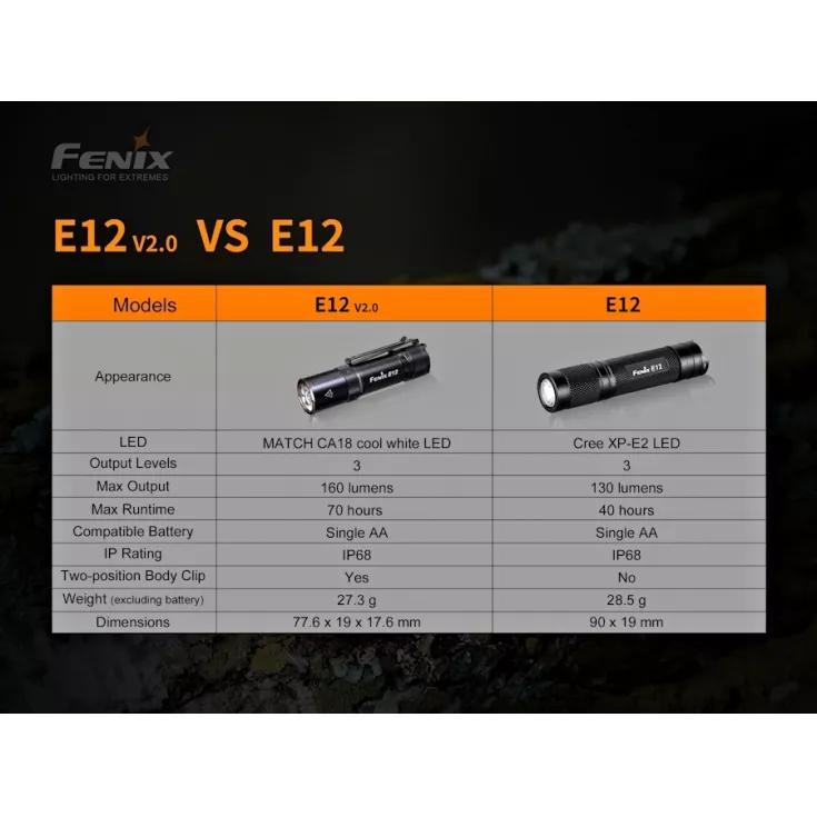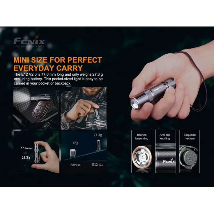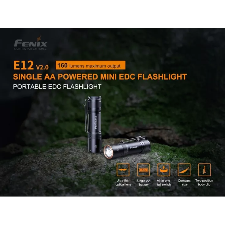 The Fenix E12 V2 is an upgrade to the original model with an improved design and output. The new E12 is still powered by a single AA battery, making it economical to run and suitable for travel or everyday carry. Weighing in at only 27.3 grams and measuring just 77.6mm long the E12 V2.0 easily fits into a pocket or bag.