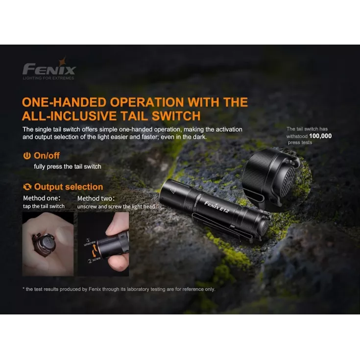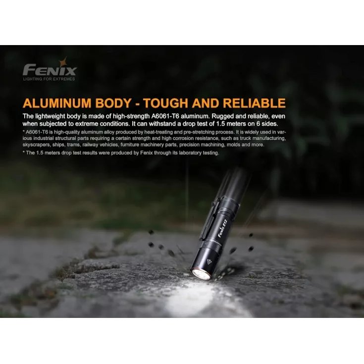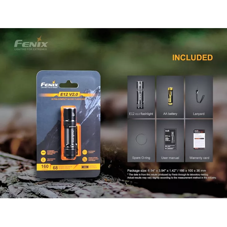 Fenix E12 V2.0 Includes: AA Battery, Wrist Lanyard, Spare O-ring, User Manual & Warranty Card.