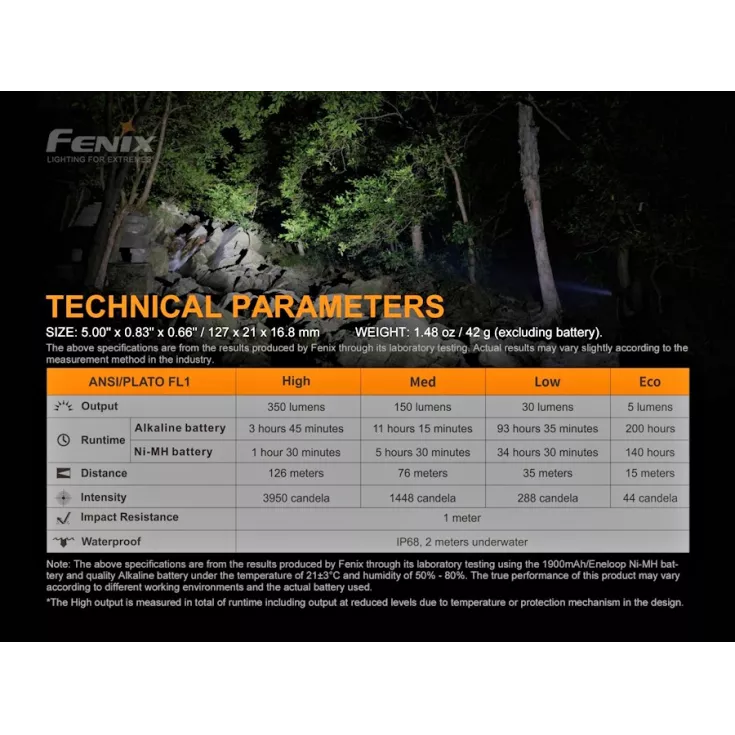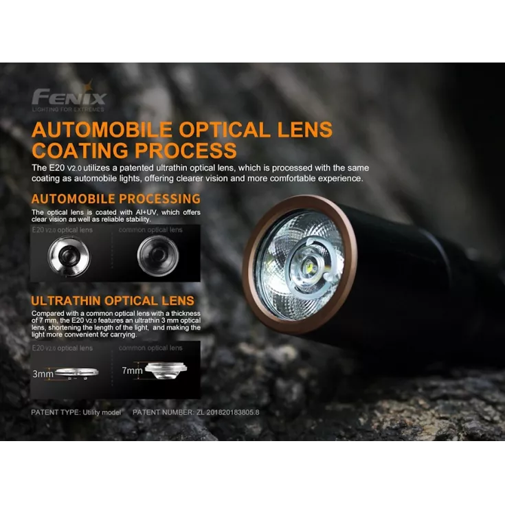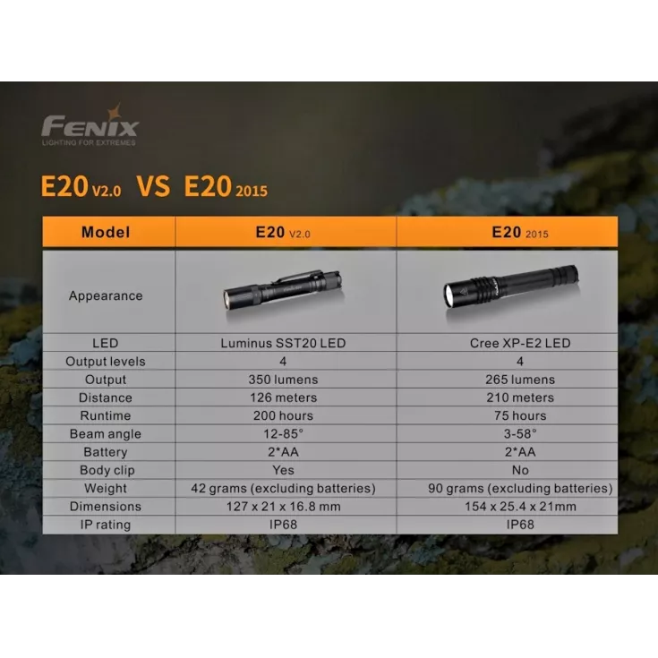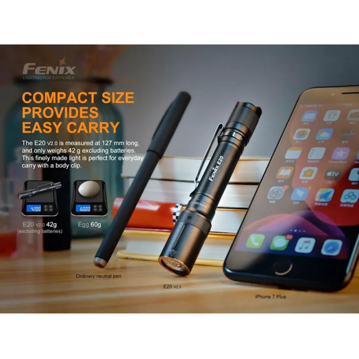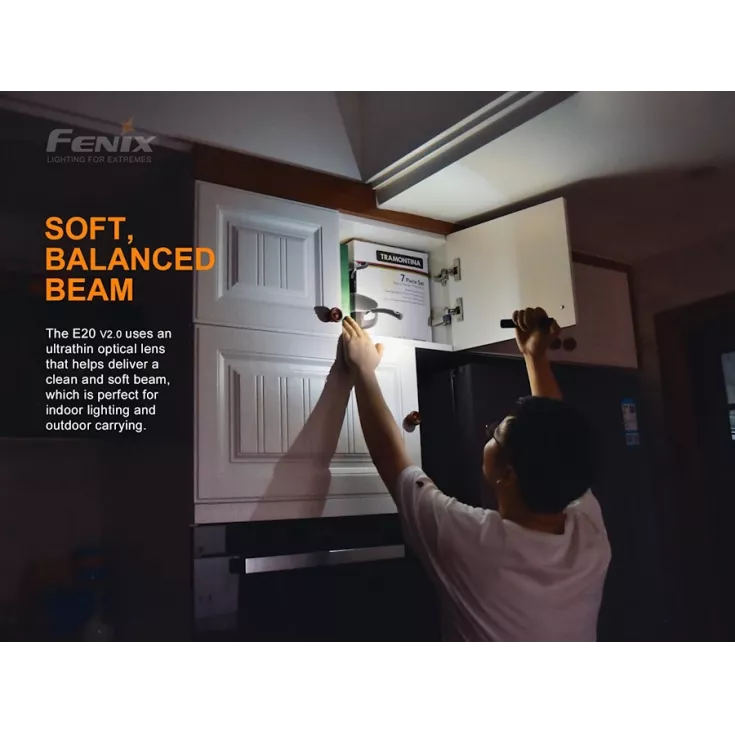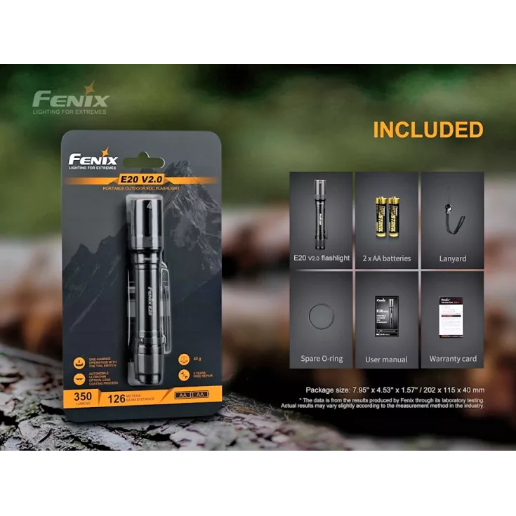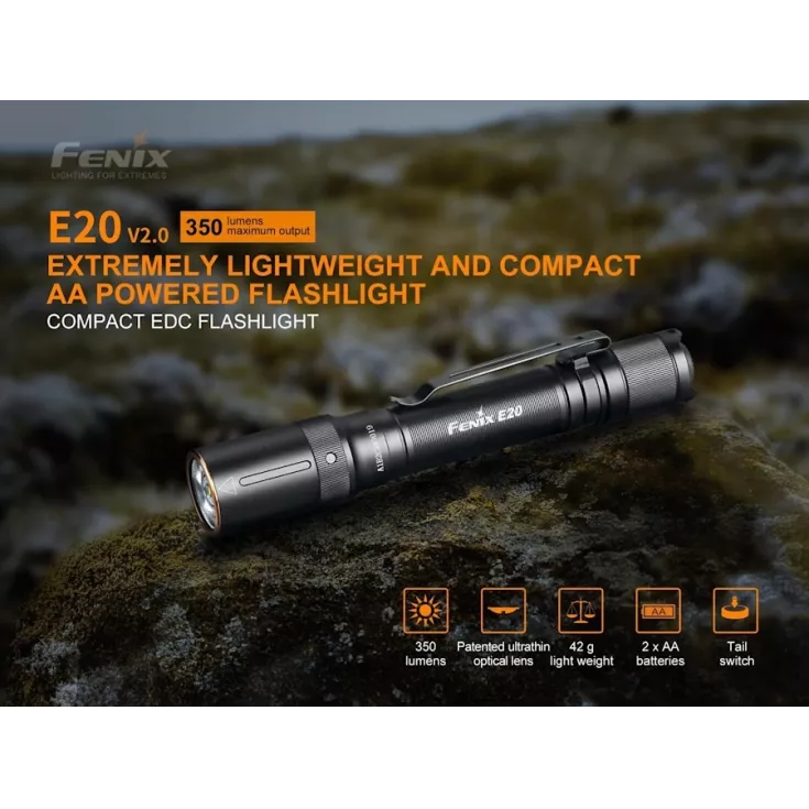 The Fenix E20 V2.0 flashlight offers a maximum output of 350 lumens from the Luminus SST20 LED and is powered by 2 x AA batteries (alkaline or NiMH). By using such widely available batteries and with a compact, lightweight design, the torch is ideal for everyday carry.
