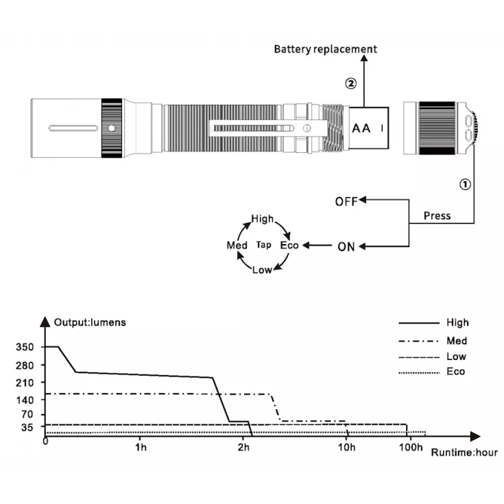 Eco: 5 lumens – 200 hrs runtime