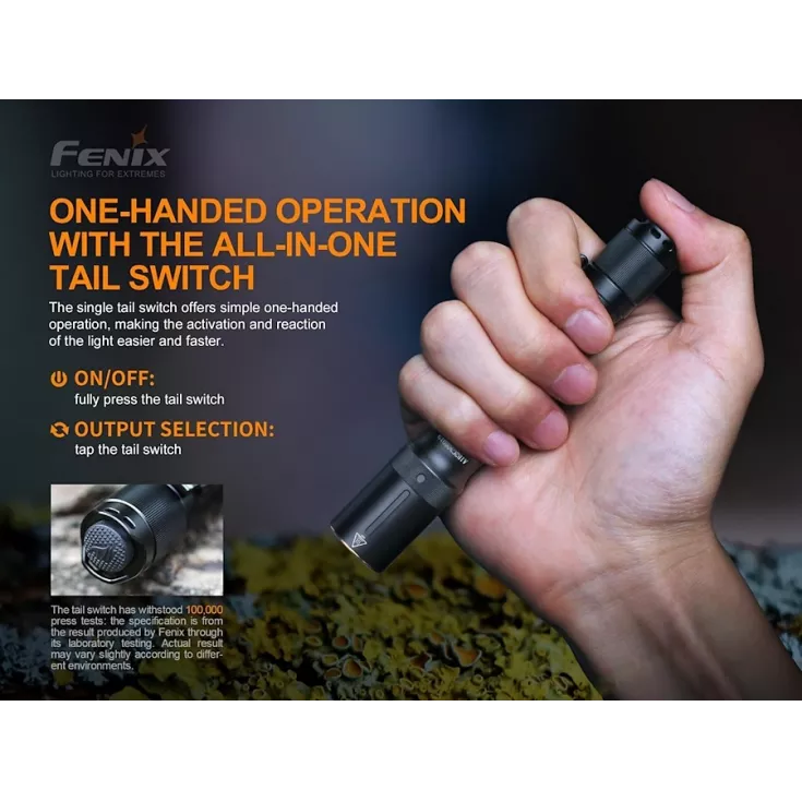 The torch is operated by a single switch on the tail end of the light, allowing fast and easy access to the four brightness levels. Fully click the switch to turn the light on and off and once on, tap the switch to cycle through the modes.