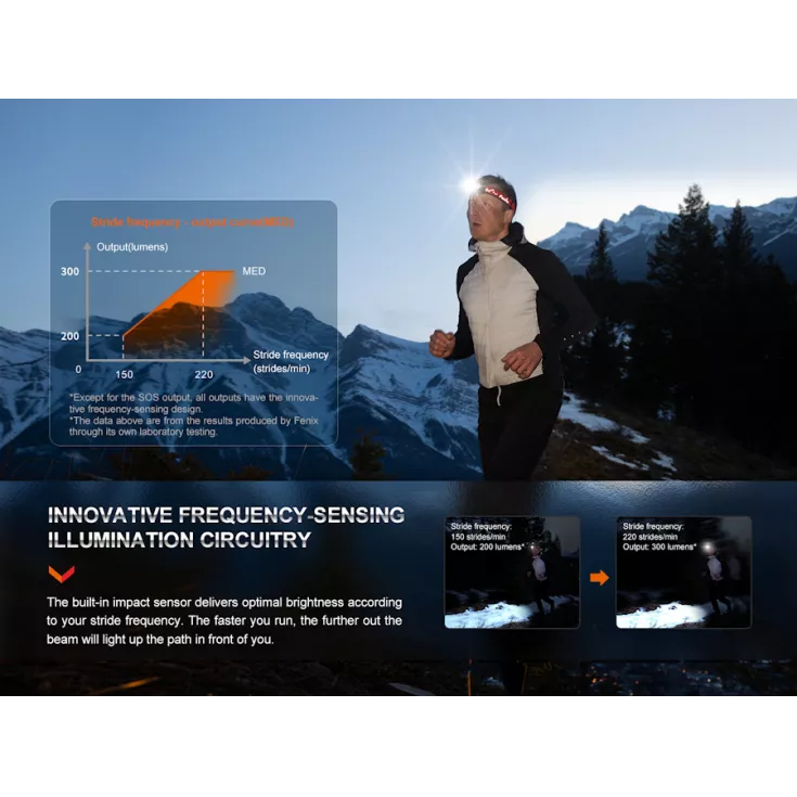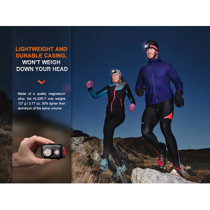 The Fenix HL32R-T is an ultralight rechargeable headtorch offering a powerful spot and flood beam, producing a maximum output of 800 lumens. The torch incorporates a frequency sensor which proportionally increases output between 150 and 220 strides a minute, lighting the trail further ahead when you pick up the pace.