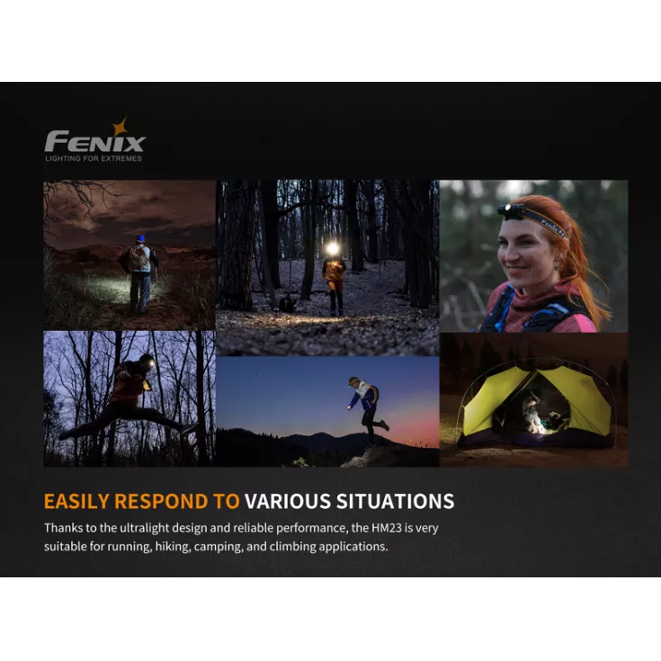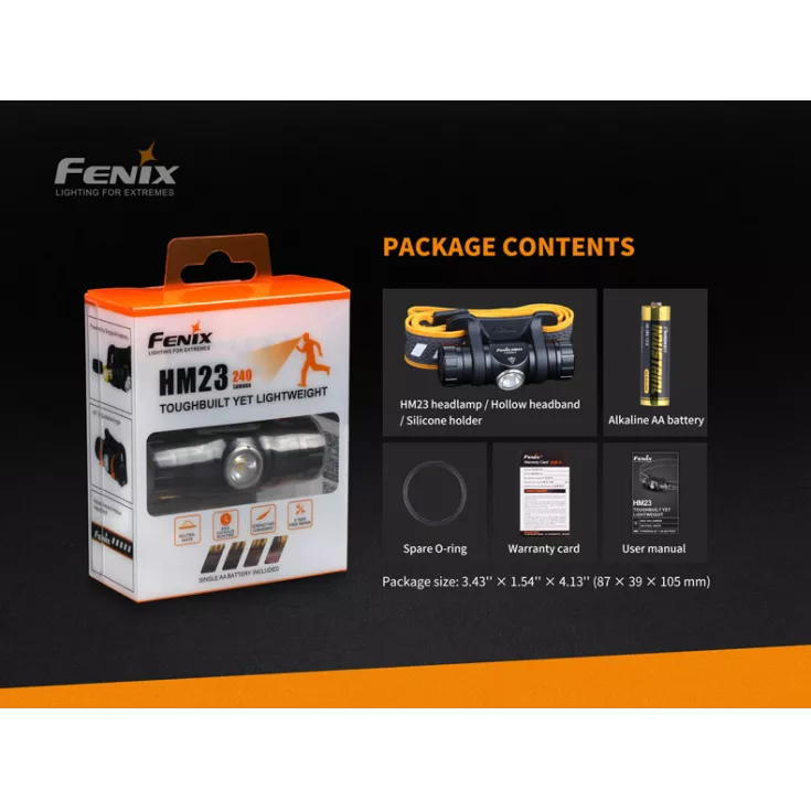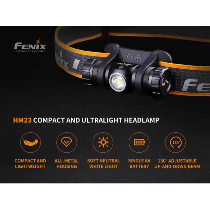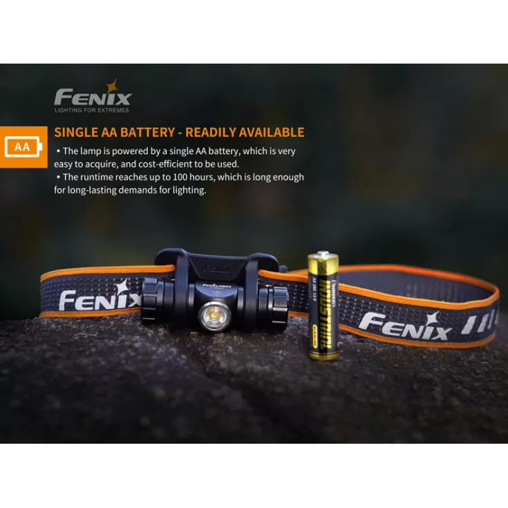 The Fenix HM23 head torch offers a maximum output of 240 lumens and is powered by 1 x AA battery (alkaline or NiMH). Lightweight and compact, the headlamp is the ideal companion for trail running, hiking and camping expeditions.