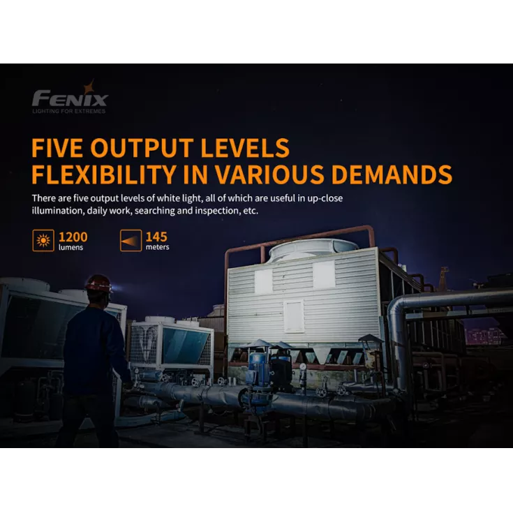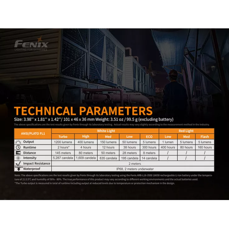 Turbo*: 1200 lumens – 2 hours runtime – 145 meters