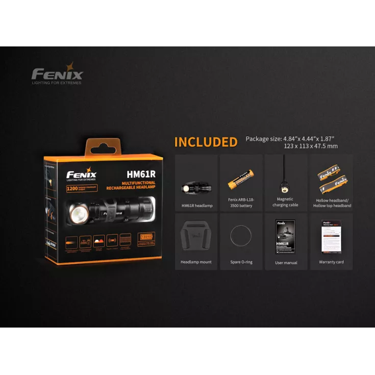 Fenix HM61R Includes: ARB-L18-3500 18650 li-ion battery, magnetic charging cable, headband, pocket clip and spare o-ring.