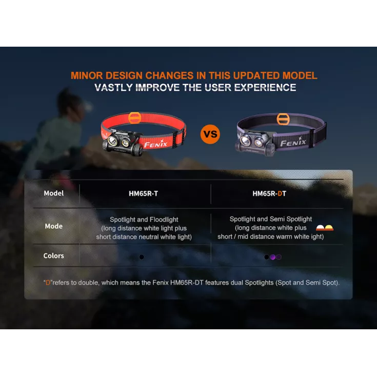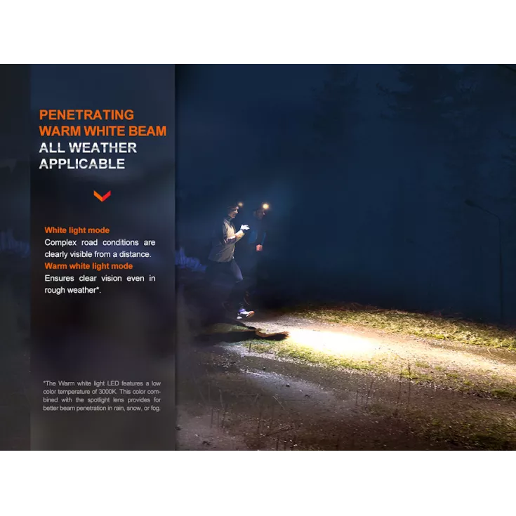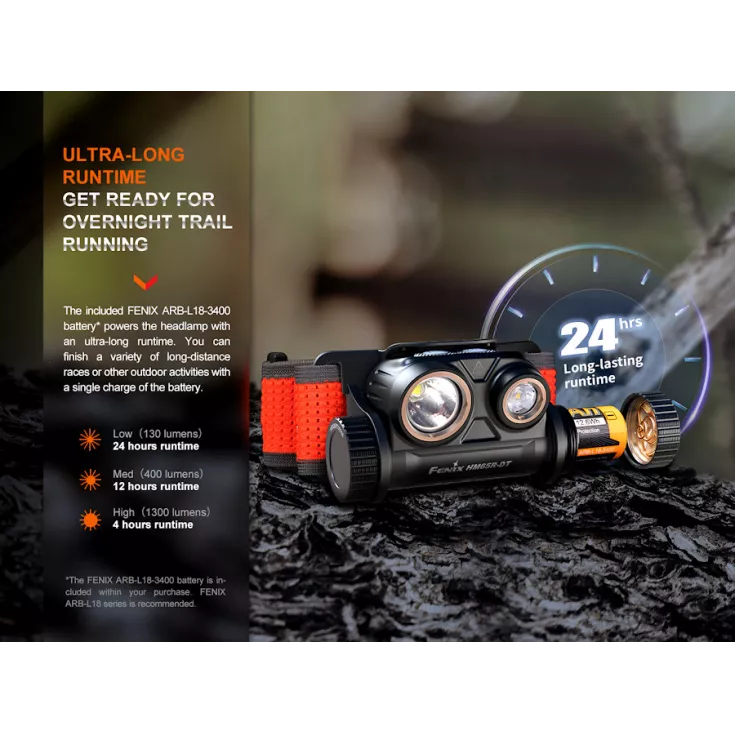 The Fenix HM65R-DT trail running rechargeable headlight has a maximum output of 1500 lumens from the Luminus SST40 white and SST20 warm white LED’s and is powered by a single 18650 battery (included).
