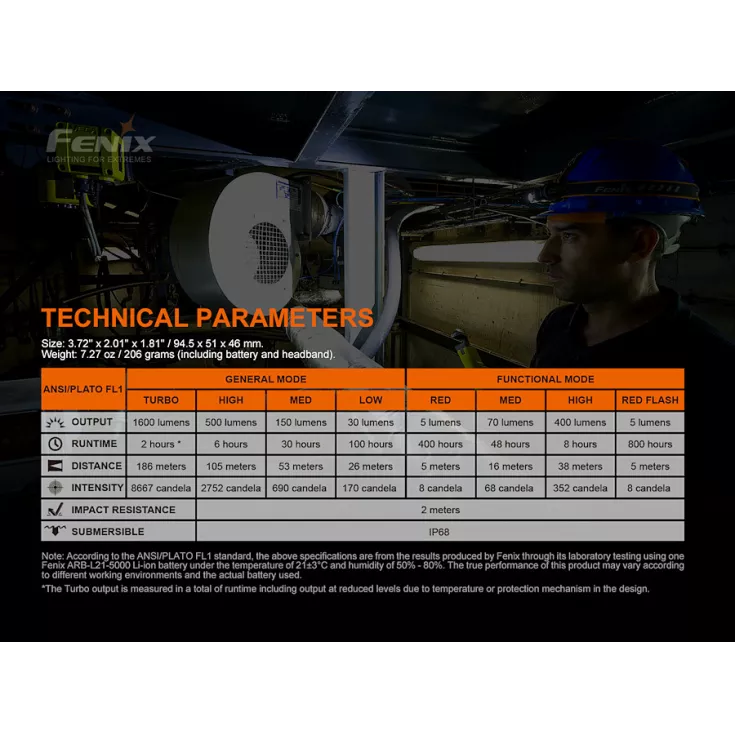 Turbo: 1600 lumens – 2 hours* – 186 meters