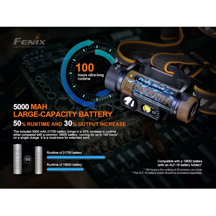 The Fenix HM70R is a rechargeable head torch, powered by a 21700 Li-ion battery for optimal performance and runtimes. A 5000mAh 21700 ARB-L21-5000 cell is included. 18650 cells are also compatible when used an ALF-18 battery holder (available separately).