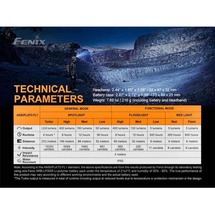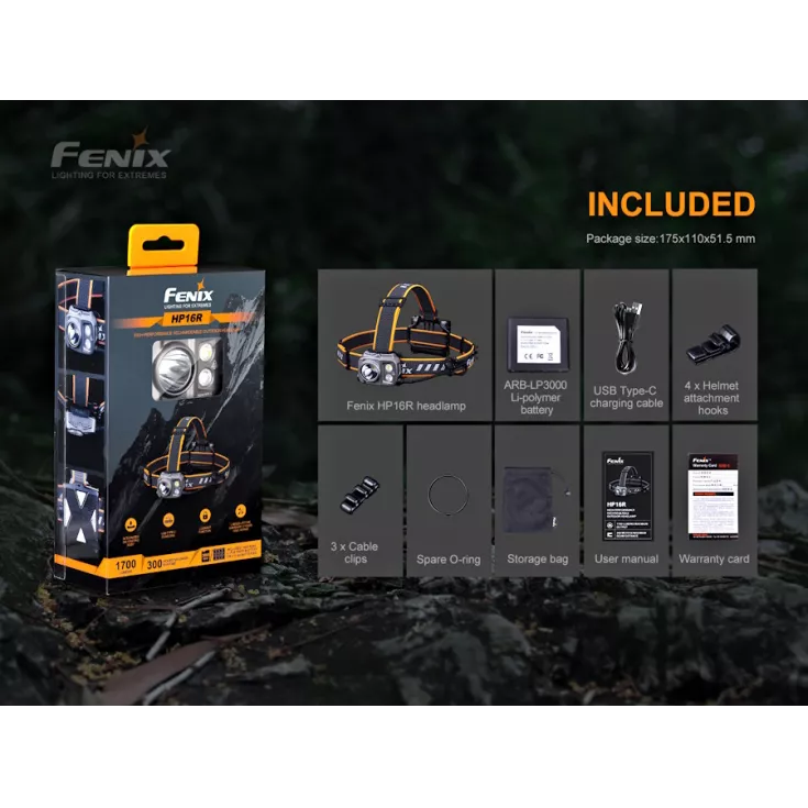 Fenix HP16R includes: Fenix ARB-LP3000 3000mAh Li-polymer battery, USB Type-C charging cable, 4 x helmet attachment hooks, 3 x cable clips, spare o-ring and storage bag.