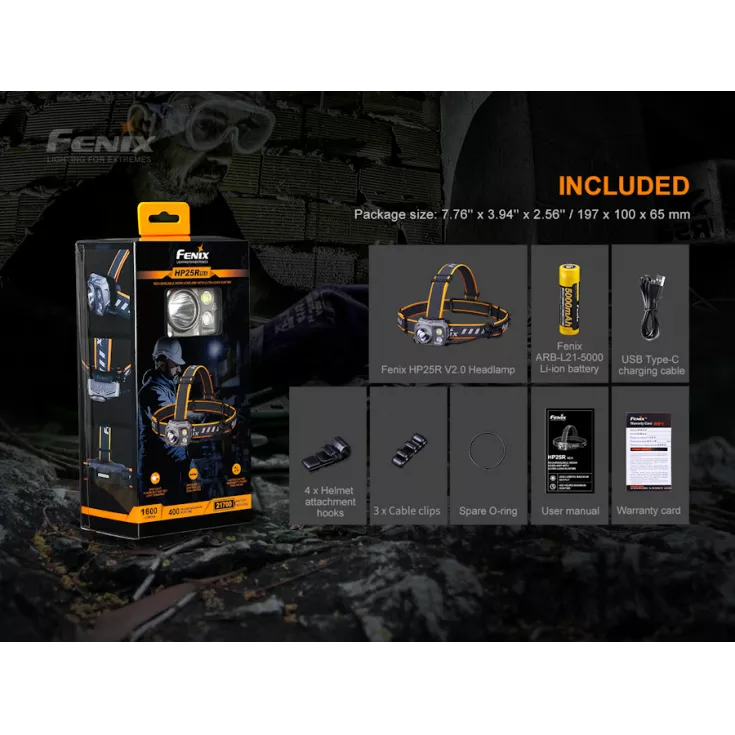 Fenix HP25R V2 includes: Fenix ARB-L21-5000 Li-ion 21700 battery, USB type-C charging cable, 4 x helmet attachment hooks, 3 x cable clips and spare o-ring.