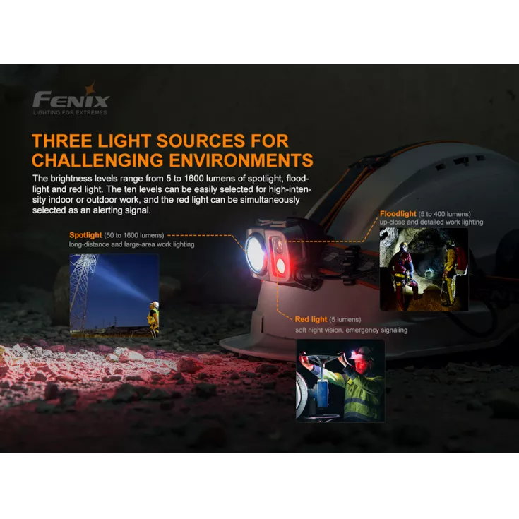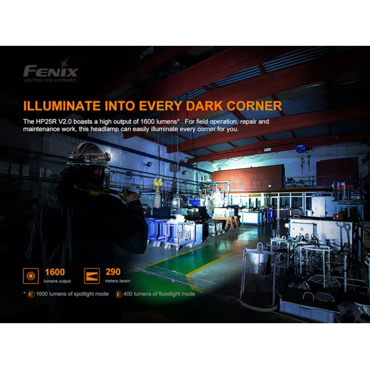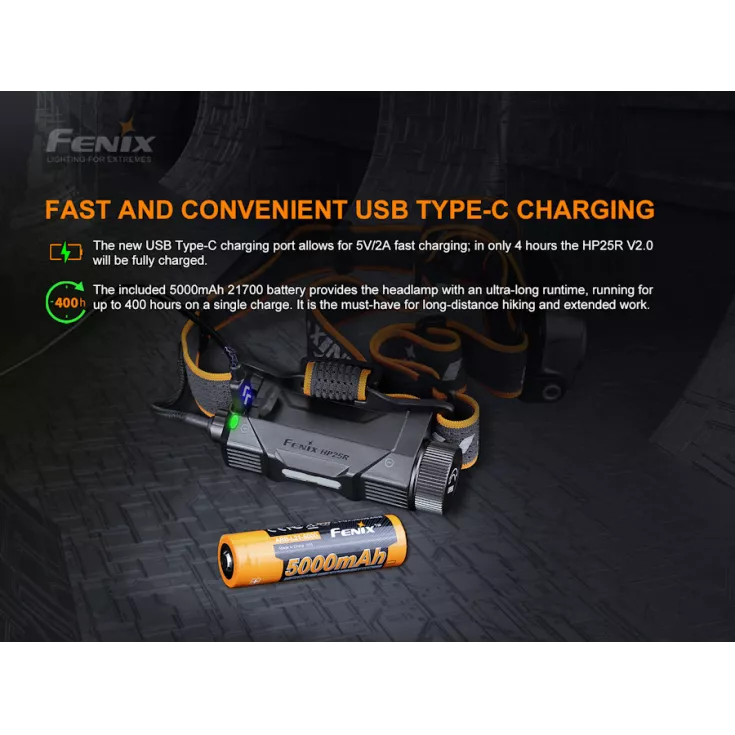The Fenix HP25R Version 2.0 is a rechargeable head torch with a built-in 5000mAh Li-ion battery that features three light sources; white spotlight, white floodlight and red light.