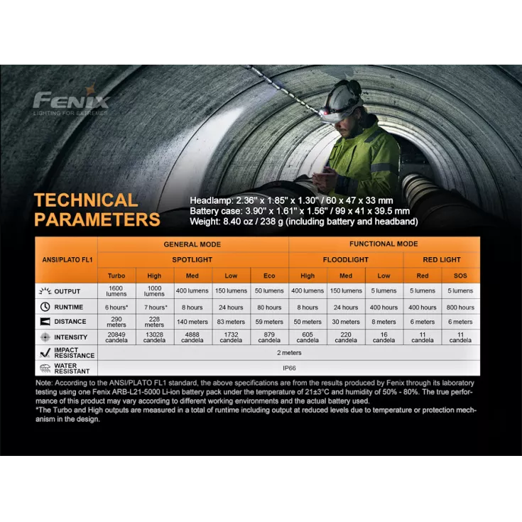 Turbo: 1600 lumens – 2 hours (output will dim to 550 lm after 10 minutes to prevent overheating). Turbo output can be re activated once the headlamp cools – 290 meters