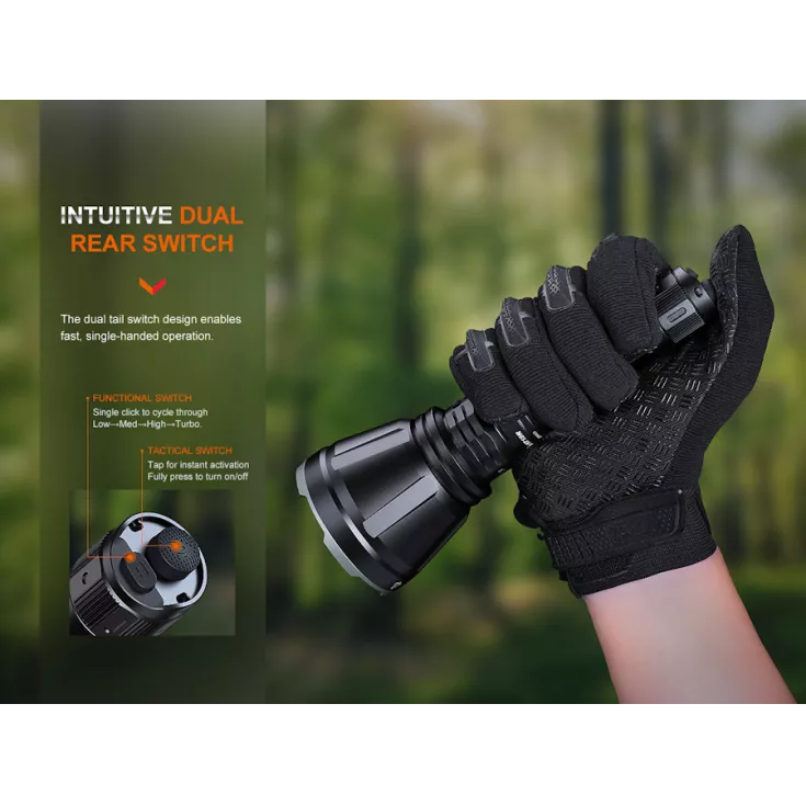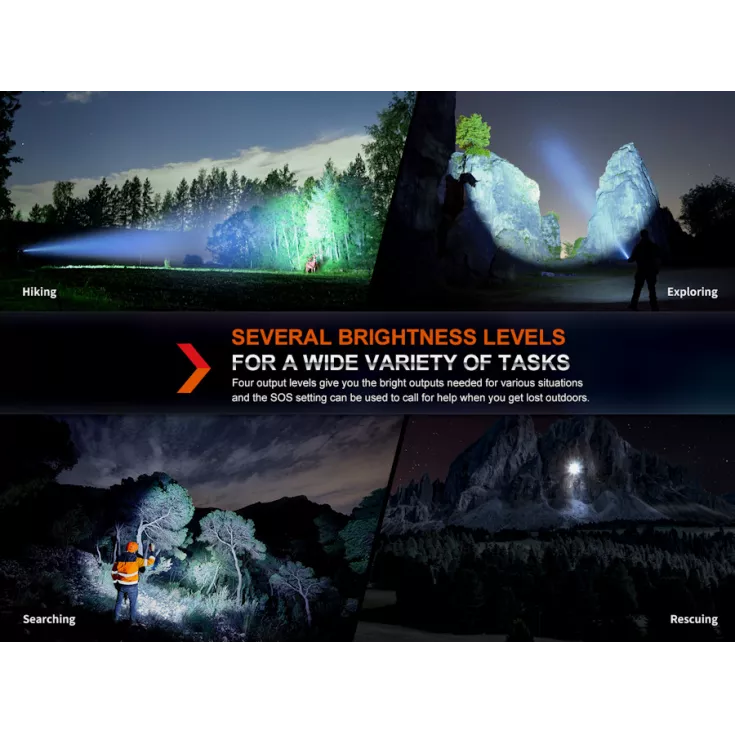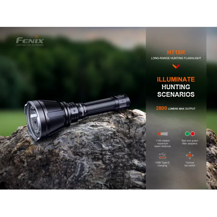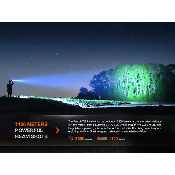 The Fenix HT18R is a compact, rechargeable torch with a maximum output of 2800 lumens and an extremely impressive maximum beam distance of 1100 meters. This is the ultimate torch for search and rescue, security and farming. The torch is powered by a 21700 li-ion rechargeable battery (included) which can be charged in the torch, using the USB-C charging port.
