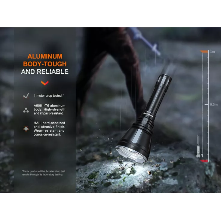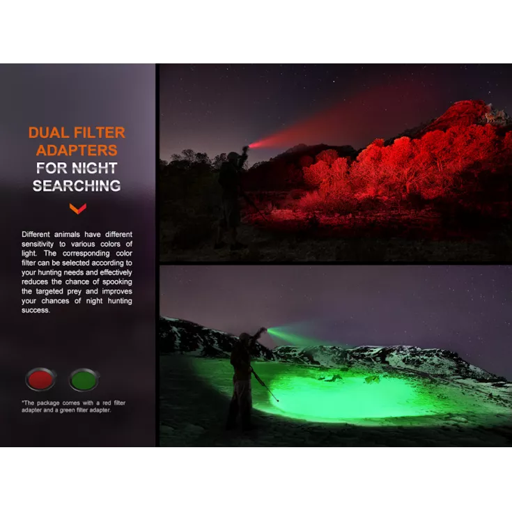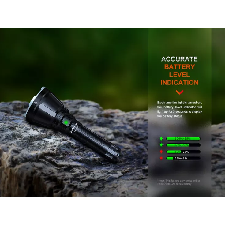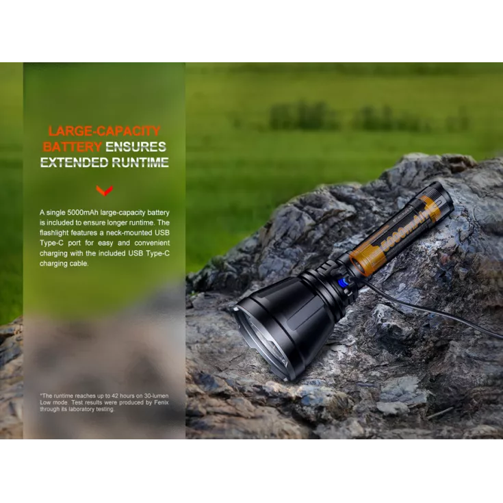 Included: Fenix ARB-L21 5000mAh battery, USB-C charging cable, holster, lanyard, spare o-ring, red filter adapter, green filter adapter.