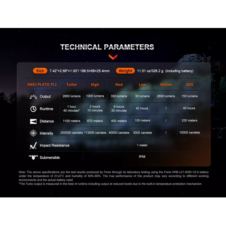 Turbo: 2800 lumens (1 hr 40 min total), 1100m beam