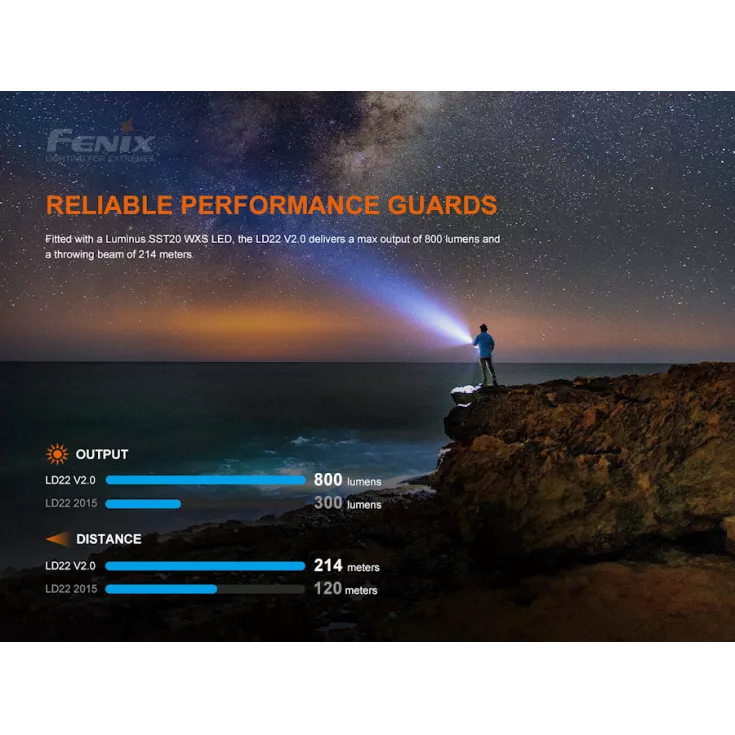 Featuring a Luminus SST20 WXS LED, with a maximum output of 800 lumens and a range of up to 214 meters when used with the rechargeable battery pack.