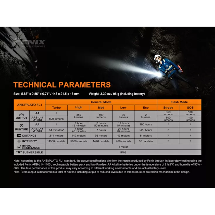 Turbo: 800 lumens – 54 minutes – 214 meters
