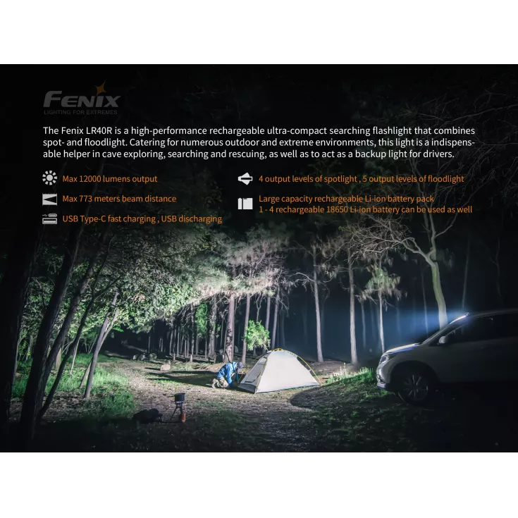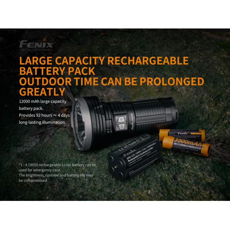 The Fenix LR40R searchlight offers an impressive maximum output of 12,000 lumens from the combination of spot and flood light LEDs. The torch is powered by a rechargeable, Li-ion battery pack which houses 4 x 18650 batteries. In an emergency situation the LR40R can be powered by 1, 2 or 3 18650 cells, but please note this will affect the output and runtime.