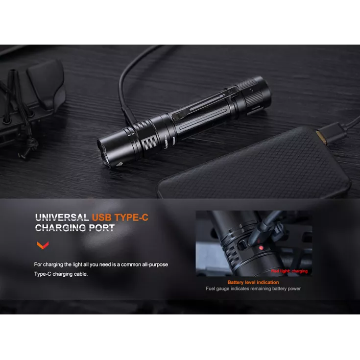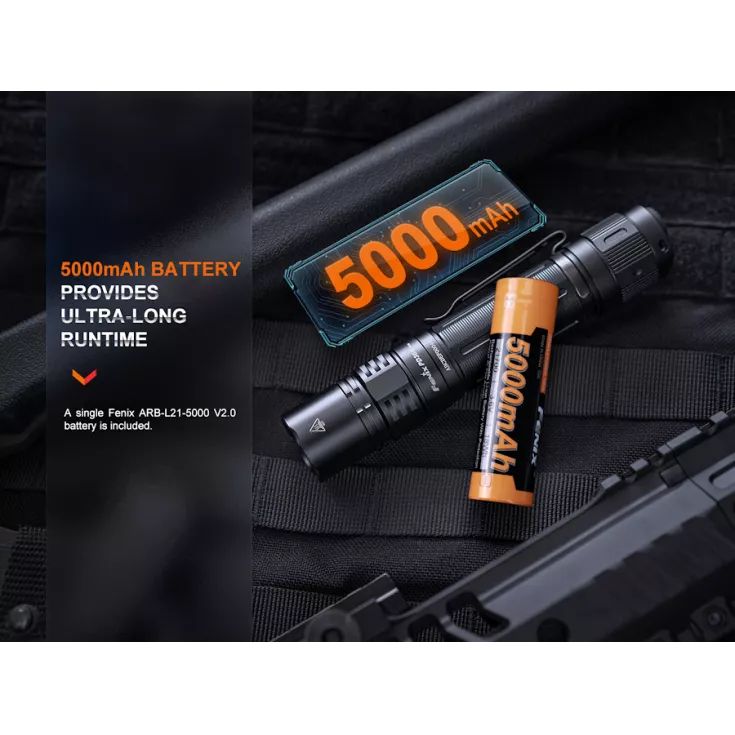 Includes: Fenix ARB-L21-5000 V2 li-ion 5000mAh 21700 battery, USB type-C charging cable, holster, lanyard, spare o-ring.